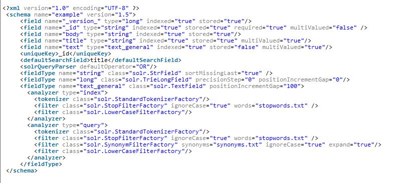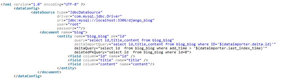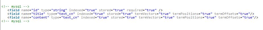 (2)deltaImportQuery 根据ID取得需要进入的索引的单条数据。 (3)deltaQuery 用于增量索引的sql语句,用于取得需要增量索引的ID。 (4)deletedPkQuery 用于取出需要从索引中删除文档的的ID 5.为数据库表字段建立域(field),编辑E:\solr-4.8.0\example\solr\collection1\conf\schema.xml 如图5所示 图5 6.配置增量索引更新文件 参考文献: