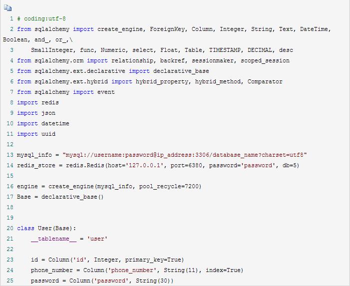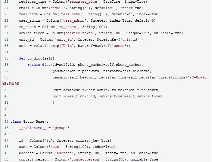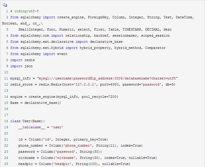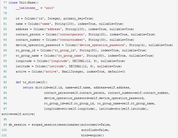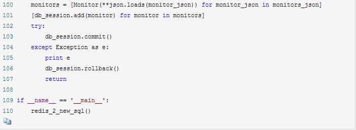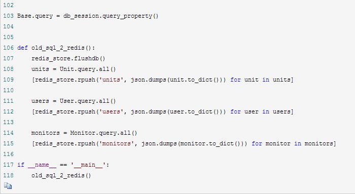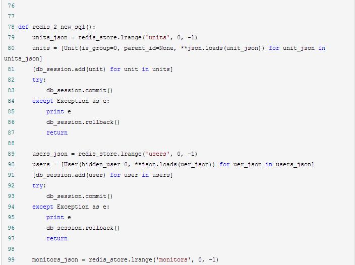 利用redis协助mysql数据库搬迁的方法 最近公司新项目上线,需要数据库搬迁,但是新版本与老版本数据库差距比较大,关系也比较复杂。如果用传统办法,需要撰写很多mysql脚本,工程量虽然不大,但对于没有dba的公司来说,稍微有点难度。本人就勉为其难,用redis作为mysql中转站,先把原来的mysql数据转移到redis里面,再从redis转换到新的mysql。整个过程脉络清晰,脚本简单。 首先,公司之前的项目是,flask+sqlalchemy的方式,直接复制原来的model文件,稍微修改一下,就有以下代码。如下所示: 把原来的数据库复制到本地redis了,看查看里面的元素。比如user数据,直接建一个user的list,每个appened其json格式的数据就可以了。主要注意点就是,如果新版本的表中没有的字段,就不要写入的redis了。 第二步就是把本地redis里面的数据,放到新的数据库上。这边要注意以下,把需要修改的地方要标示出来,可能加了其他字段,这些字段没有默认值的话,要自己添加上。过程也比较简单。代码如下所示: 整个过程相当简单,需要注意的就是,前后顺序,因为user和monitor都有一个外键指向unit,所以要先恢复unit表,这样就不会出错了。