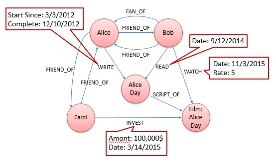 图形数据库Neo4J 相信大家都听说过NoSQL数据库。它们常常可以用来处理传统的关系型数据库所难以解决的一系列问题。通常情况下,这些NoSQL数据库分为Document,Graph,Column Family和Key-Value Store等四种。这四种类型的数据库分别使用了不同的数据结构来记录数据。因此它们所适用的场景也不尽相同。 其中最为特别的就是图形数据库了。可以说,它和其它的一系列NoSQL数据库非常不同:丰富的关系表示,完整的事务支持,却没有一个纯正的横向扩展解决方案。 在本文中,我们就将对业界非常流行的图形数据库Neo4J进行简单的介绍。 图形数据库 大家在使用关系型数据库时常常会遇到一系列非常复杂的设计问题。比如一部电影中的各个演员常常有主角配角之分,还要有导演,特效等人员的参与。通常情况下这些人员常常都被抽象为Person类型,对应着同一个数据库表。同时一位导演本身也可以是其它电影或者电视剧的演员,更可能是歌手,甚至是某些影视公司的投资者(没错,我这个例子的确是以赵薇为模板的)。而这些影视公司则常常是一系列电影,电视剧的资方。这种彼此关联的关系常常会非常复杂,而且在两个实体之间常常同时存在着多个不同的关系,如下图所示: 在尝试使用关系型数据库对这些关系进行建模时,我们首先需要建立表示各种实体的一系列表:表示人的表,表示电视剧的表,表示电影的表,表示影视公司的表等等。这些表常常需要通过一系列关联表将它们关联起来:通过这些关联表来记录一个人到底参演过哪些电影,参演过哪些电视剧,唱过哪些歌,同时又是哪些公司的投资方。同时我们还需要创建一系列关联表来记录一部电影中哪些人是主角,哪些人是配角,哪个人是导演,哪些人是特效等。可以看到,我们需要大量的关联表来记录这一系列复杂的关系。在更多实体引入之后,我们将需要越来越多的关联表,从而使得基于关系型数据库的解决方案繁琐易错。 这一切的症结主要在于关系型数据库是以为实体建模这一基础理念设计的。该设计理念并没有提供对这些实体间关系的直接支持。在需要描述这些实体之间的关系时,我们常常需要创建一个关联表以记录这些数据之间的关联关系,而且这些关联表常常不用来记录除外键之外的其它数据。也就是说,这些关联表也仅仅是通过关系型数据库所已有的功能来模拟实体之间的关系。这种模拟导致了两个非常糟糕的结果:数据库需要通过关联表间接地维护实体间的关系,导致数据库的执行效能低下;同时关联表的数量急剧上升。 这种执行效能到底低下到什么程度呢?就以建立人和电影之间的投资关系为例。一个使用关联表的设计常常如下图所示: 如果现在我们想要通过该关系找到一部电影的所有投资人,关系型数据库常常会执行哪些操作呢?首先,在关联表中执行一个Table Scan操作(假设没有得到索引支持),以找到所有film域的值与目标电影id相匹配的记录。接下来,通过这些记录中的person域所记录的Person的主键值来从Person表中找到相应的记录。如果记录较少,那么这步就会使用Clustered Index Seek操作(假设是使用该运算符)。整个操作的时间复杂度将变为O(nlogn): 可以看到,通过关联表组织的关系在运行时的性能并不是很好。如果我们所需要操作的数据集包含了非常多的关系,而且主要是在对这些关系进行操作,那么可以想象到关系数据库的性能将变得有多差。 除了性能之外,关联表数量的管理也是一个非常让人头疼的问题。刚刚我们仅仅是举了一个具有四个实体的例子:人,电影,电视剧,影视公司。现实生活中的例子可不是这么简单的。在一些场景下,我们常常需要对更多的实体进行建模,从而完整地描述某一领域内的关联关系。这种关联关系所涵盖的可能包含影视公司的控股关系,各控股公司之间复杂的持股关系以及各公司之间的借贷款情况及担保关系等,更可能是人之间的关系,人与各个品牌之间的代言关系,各个品牌与所属公司之间的关系等。 我们可以看到,在需要描述大量关系时,传统的关系型数据库已经不堪重负。它所能承担的是较多实体但是实体间关系略显简单的情况。而对于这种实体间关系非常复杂,常常需要在关系之中记录数据,而且大部分对数据的操作都与关系有关的情况,原生支持了关系的图形数据库才是正确的选择。它不仅仅可以为我们带来运行性能的提升,更可以大大提高系统开发效率,减少维护成本。 在一个图形数据库中,数据库的最主要组成主要有两种,结点集和连接结点的关系。结点集就是图中一系列结点的集合,比较接近于关系数据库中所最常使用的表。而关系则是图形数据库所特有的组成。因此对于一个习惯于使用关系型数据库开发的人而言,如何正确地理解关系则是正确使用图形数据库的关键。 注:这里的结点集是我自己的翻译。在Neo4J官方文档中,其被称为label。原文为:A label is a named graph construct that is used to group nodes into sets; all nodes labeled with the same label belongs to the same set。我个人觉得生硬地取名为标签反而容易让别人混淆,所以选取了“group nodes into sets”的意译,也好让label和node,即结点集和结点之间的关系能够更好地对应。 但是不用担心,在了解了图形数据库对数据进行抽象的方式之后,您就会觉得这些数据抽象方式实际上和关系型数据库还是非常接近的。简单地说,每个