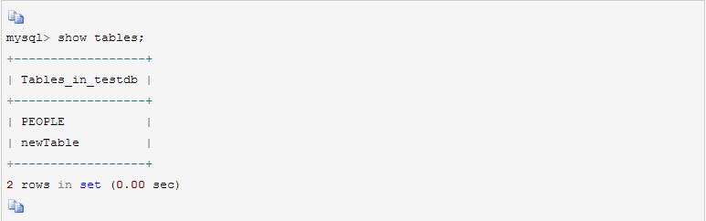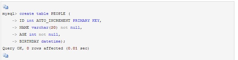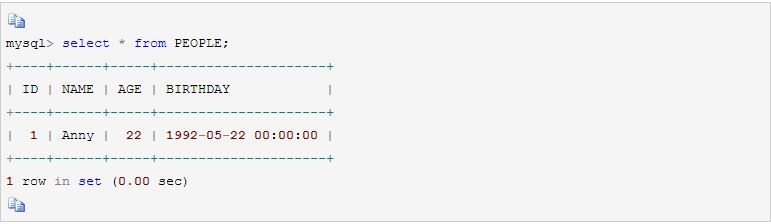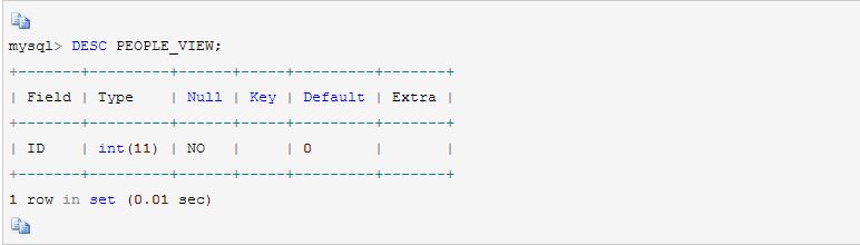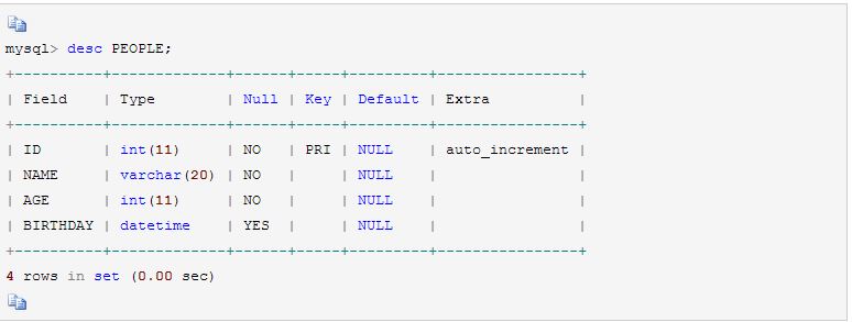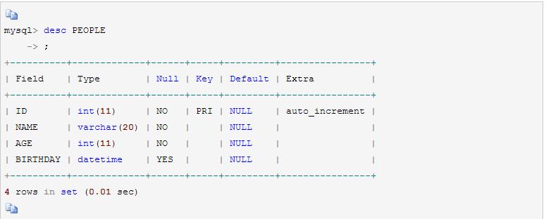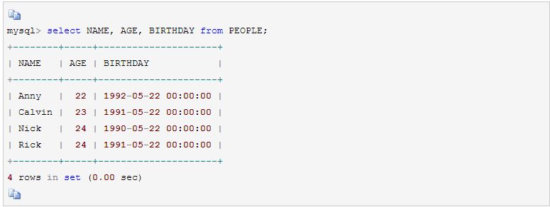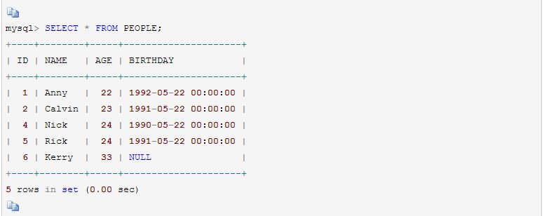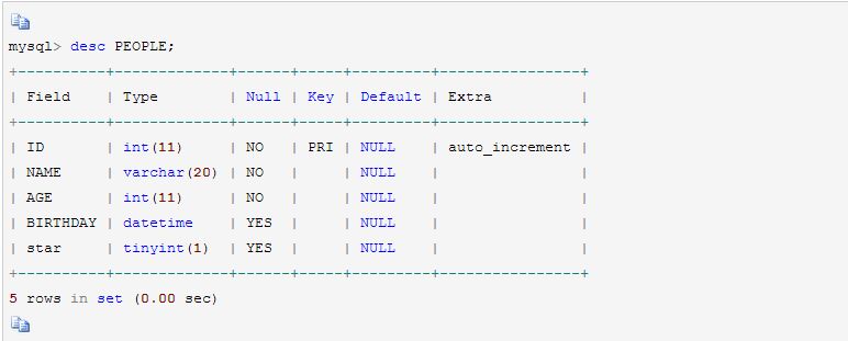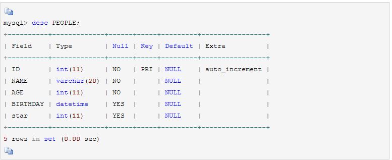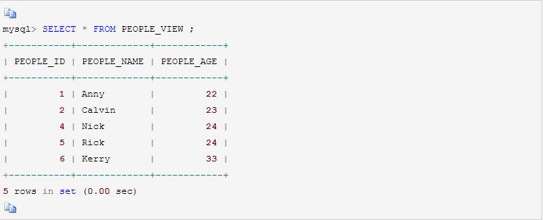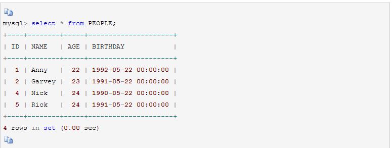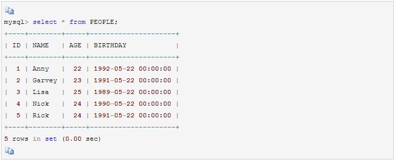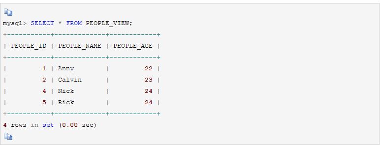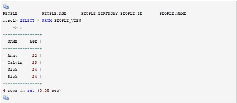 四、管理视图 一、数据库(database)管理 1. create 创建数据库 create database firstDB; 2.show 查看所有数据库,如下面的代码所示: 图1 3.alter 修改数据库 alter 命令修改数据库编码,如下面代码所示: 默认创建的数据库默认不支持中文字符,如果我们需要它支持中文字符,就需要将它的编码设置为utf8格式: mysql> ALTER DATABASE testDB CHARACTER SET UTF8; Query OK, 1 row affected (0.00 sec) 4. use 使用数据库 如下面代码所示: mysql> use firstDB; Database changed 5. 查看当前使用的数据库 图2 6. drop 删除数据库 如下面代码所示: mysql> drop database firstDB; Query OK, 0 rows affected (0.00 sec) 二、数据表(table)管理 我们首先创建一个数据库,提供我们往后的使用,如下面代码所示: mysql> create database testDB; Query OK, 1 row affected (0.00 sec) 创建后记得用use命令进入(使用)数据库,否则后面的操作都会不成功的。 1. create 创建表 如图3所示的代码: 图3 2. show 显示表 显示当前数据库所有的数据表 如图4所示的代码 图4 3. desc 查看表结构 如图5所示的代码: 图5 4.alter 修改表结构(增、删、改) 默认创建的表不支持中文字符,所以需将表编码设置为utf8,如下所示: mysql> ALTER TABLE KEYCHAIN CONVERT TO CHARACTER SET UTF8; Query OK, 1 row affected (0.02 sec) Records: 1 Duplicates: 0 Warnings: 0 4.1 insert 在表中添加列(字段) 如下所示: mysql> alter table PEOPLE add star BOOL; Query OK, 0 rows affected (0.02 sec) Records: 0 Duplicates: 0 Warnings: 0 提示:在MySQL里,布尔类型会自动转换为tinyint(1)类型。 我们不妨使用desc去查看一下PEOPLE表结构: 如图6所示: 图6 现在,你该相信我了吧? 4.2 alter 修改表(列)字段 如下所示: mysql> alter table PEOPLE MODIFY star int; Query OK, 0 rows affected (0.01 sec) Records: 0 Duplicates: 0 Warnings: 0 也可以指定 int(n) 的长度,比如 int(2)。 我们再次使用desc查看PEOPLE表结构: 图7 4.3 delete 删除表(列)字段 mysql> alter table PEOPLE DROP column star; Query OK, 0 rows affected (0.02 sec) Records: 0 Duplicates: 0 Warnings: 0 删除后,再次查看PEOPLE表结构,如图8所示的代码: 图8 删除字段成功,现在我们已经不能看到star的字段了。 4.4 rename 重命名表名 如下所示的代码: mysql> RENAME TABLE PEOPLE TO NEW_PEOPLE; Query OK, 0 rows affected (0.00 sec) 4.5 null or not null 如下所示的代码: 修改表字段允许为空或不允许为空: mysql> ALTER TABLE PEOPLE MODIFY AGE INT(3) NULL; Query OK, 0 rows affected (0.01 sec) Records: 0 Duplicates: 0 Warnings: 0 把 PEOPLE 表的 AGE 字段设置成“允许为空”,即插入记录时这个字段可以不录入。否则相反。 它的格式为:ALTER TABLE MODIFY 5. create 利用已有数据创建新表 代码如下所示: mysql> create table newTable select * from PEOPLE; Query OK, 0 rows affected (0.01 sec) Records: 0 Duplicates: 0 Warnings: 0 我们查看一下目前数据库存在的表: 代码如图9所示: 图9 三、数据的操作及管理 数据表的基本操作,包含增、删、改、查数据。 以下命令均在PEOPLE表上操作。 1. 增加数据(增) PEOPLE表目前是没有数据的,它是空的数据表,我们现在先添加一些数据。 如下所示: insert into 命令添加数据: mysql> insert into PEOPLE VALUES (null, 'Anny', 22, '1992-05-22'); Query OK, 1 row affected (0.00 sec) 使用select命令查看表(会在后面介绍),现在我们查看PEOPLE数据表的数据: 图10 数据表现在有一条数据。 我们多添加几条数据,如图11所示的代码: 图11 2. 删除数据(删) delete 命令删除数据: mysql> delete from PEOPLE where name = 'Lisa'; Query OK, 1 row affected (0.01 sec) 再次查询PEOPLE表,如图12所示: 图12 已经看不到名为“Lisa”的数据了。 3. 修改数据(改) update 命令修改数据: mysql> update PEOPLE set name='Calvin' where name = 'Garvey'; Query OK, 1 row affected (0.00 sec) Rows matched: 1 Changed: 1 Warnings: 0 查询PEOPLE表内容,如图13所示: 图13 名为“Garvey”的记录已经修改为“Calvin”。 4. 查询数据(查) select 命令查询数据,最简单的就是查询表的所有数据,也就是我们最初使用到的那条命令,如图14所示: 图14 格式:select * from <表名>,*代表所有字段。 查询数据时也可指定显示的(列)字段,如图15所示: 图15 格式:select <字段名,字段名,...> from <表名>。 select查询命令还有很多的高级用法,比如用来查找不重复(distinct)的数据,使数据按条件排序(order by),按查询条件显示数据(where)等等。这些都会在下一篇文章作重点介绍,请大家继续留意我的博客,谢谢。 四、管理视图 1.创建视图 视图是从数据库里导出一个或多个表的虚拟表,是用来方便用户对数据的操作。如下所示: mysql> CREATE VIEW PEOPLE_VIEW ( -> NAME, AGE) -> AS SELECT NAME, AGE FROM PEOPLE; 创建成功后查看视图。 图16 我们也可以使用 DESC 命令查看视图的结构,如图17所示。 图17 2.替换视图 创建或替换原有视图。 mysql> CREATE OR REPLACE VIEW PEOPLE_VIEW(PEOPLE_ID,PEOPLE_NAME,PEOPLE_AGE) AS SELECT ID,NAME,AGE FROM PEOPLE; Query OK, 0 rows affected (0.00 sec) 创建或替换后查看视图。 图18 3.操作视图 当视图数据有变化时(增、删、改),真实的表数据也会随着改变。也就是说,对视图的操作就是对表的数据,所以我们可以把视图当作表。 例:往视图插入一条数据。 mysql> INSERT INTO PEOPLE_VIEW VALUES(NULL, 'Kerry', '33'); Query OK, 1 row affected (0.00 sec) 插入数据成功后查看视图,如图19所示。 图19 可以在视图上看到我们刚刚插入的数据,现在我们就来验证一下真实的表是否也会作出变化,如图20所示。 图20 可见,真实的表数据也已经有所改变,刚刚往视图里插入的那一条数据存在于真实表中,真理便是: