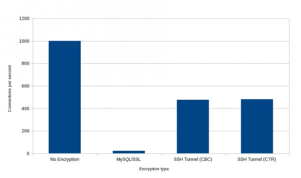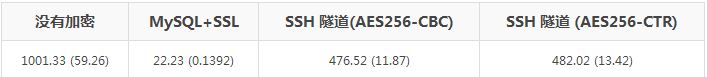 一些测试使用的是MySQL5.6.13-community,另一部分是使用Percona Server5.6.13. 二、外部加密技术 在这次测试中,我在没有一个真正vpn的情况下,用最常用的方式创建一个站-站连接:SSH通道。我没有找到足够的设备来组建一个硬件加速的VPN,但是这些也说明了问题。MySQL/SSL使用的默认SSL加密组件是DHE-RSA-AES256-SHA;我们稍微解释一下,这个含义是 使用SHA1算法作为我们的hash函数,RSA作为身份认证,256位AES(在CBC模式下,根据OpenSSL文档)加密来实现 Diffie-Hellman密钥交换。虽然可能并不明显,通过OpenSSL是很容易模仿同样的加密套件的。SSH version2协议默认使用DHE/RSA/SHA1,因此我们需要的就是在建立我们的通道时指定AES256-CBC加密器,出于所有的意图和猜测, 我们会对比加密结果。出于好奇,我们也会尝试在SSH通道的CTR模式下使用AES256,由于这能够加密block,因此理论上将会稍微快一点,但是至少在这个测试中,最终结果上的这点差别微乎其微。如下表所示: 表1: 于这个测试的机器是C机器(服务器)与D机器(客户端),这两个机器同在一个千兆比特的以太网VLAN链中,测试脚本和第一部分的脚本相似,其目的 就是尽可能快的创建100个连接。每个测试配置运行10遍,下面的表格列出了平均值与标准差,列出的数字是每一秒创建的连接数。我们也要注意到这个特殊 的测试,所有的密钥都是4096比特长,而且所有测试是在Percona Server 5.6.13上运行的。 如下表所示: 很明显,没有加密是最快的,但是通过SSH隧道创建连接的方式和MySQL本地SSL的方式相比并没有损失多少性能。无论是100 cps或是22 cps都是不现实的,但我敢打赌对于大多人来说,每个独立的线程产生470-480 cps的数目是仍然可以提供服务的。 三、高延迟链路的连接性能 在我文章的后边会给出测试数据。事实上,SSL连接的稳定性受网络延迟的影响。 从上述结果中我们可以看到,在低延迟链路,使用SSL对性能有显著的影响,那么在广域网会怎么样?有可能一种情况下考虑到了网络简单往返时间的延迟,使用 了MySQL内置的SSL支持,混合加密就不会影响太多的性能。 所以,这次测试中,我拆成了两个不同的 Amazon EC2实例(就是上述的设备A和设备B)。 设备C位于加州北部用来当做client, 这次测试是在MySQL集群和Percona服务器下测试,密钥大小范围从0到4096为位。SSL密码组件使用的是默认设置,测试脚本7与以前一样需要运 行10次,快速创建100个链接,并且每秒刷新连接结果。当然在测试中,这些原始数据是次要的,我们只是想看一下网络延迟都SSL性能的影响。