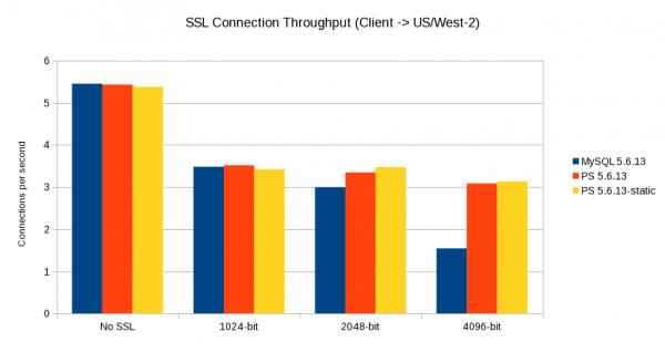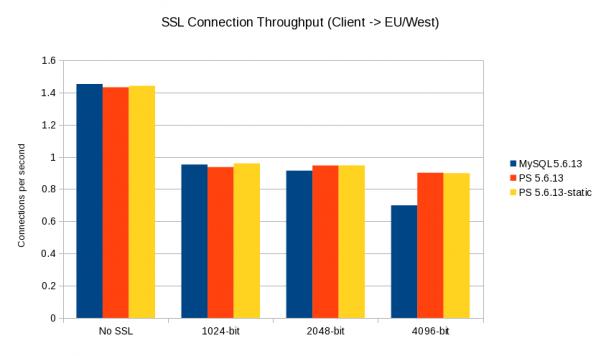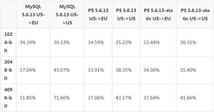 这很有道理, 特别是在一种常见的情况下 (服务器在同一个内网,或者通过TCP连接到同一个服务器), 连接的吞吐性能主要由使用不使用SSL来影响了。 当然,MySQL集群4096-bit加密的价格与Percona服务器相比,以上这些根本就没有任何意义了。有一些特别的手段用来对MySQL集群 4096-bit 加密性能提升,但看起来并没有对Percona服务器影响多少。我不确定这是一个很好的假设,在这两次测试中我都可能说是一个PEBCAT。因此,如果其 他人也在测试,我很好奇的想知道,你是否也得到相同的结构。 四、最后思考 先不论MySQL 5.6.13与4096-bit SSL的问题, 我认为这篇文章追逐要表达的与它的前任讲述的也是十分清晰的(译不懂前任的意思):若需要端到端加密你的MySQL传输,MySQL的内置的SSL支持你使用复制或连接池类的工作量,可能也会满足你的需求,但你的应用是需要频繁的创建和销毁大量的连接,只通过SSH隧道的方式你能减轻加密的负载。