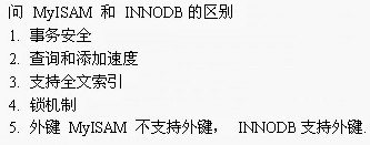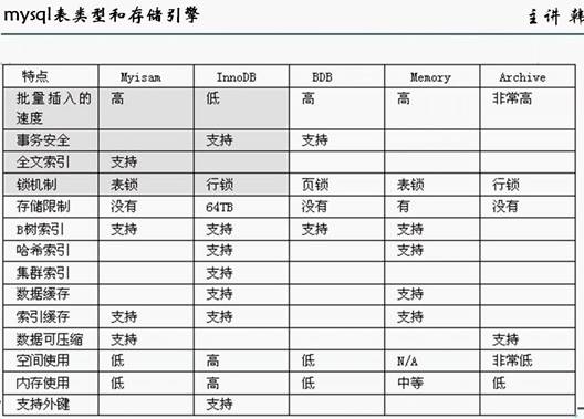 MySQL与其他的大型数据库比如Oracle、DB2、SQL Server等相比,MySQL虽然有它的不足之处,如规模小、功能有限(MySQL Cluster的功能与效率都相对比较差)等,但是这丝毫也没有减少它受欢迎的程度。 二、存储引擎: 1.MyISAM Mysql5.5之前的默认数据库引擎,最为常用。拥有较高的插入,查询速度,但不支持事务 2.InnoDB 事务型数据库的首选引擎,支持ACID事务,支持行级锁定, MySQL 5.5起成为默认数据库引擎 3.BDB 源自Berkeley DB,事务型数据库的另一种选择,支持COMMIT和ROLLBACK等其他事务特性 4.Memory 所有数据置于内存的存储引擎,拥有极高的插入,更新与查询效率。但会占用与数据量成正比的内存空间。而且其内容会在Mysql重新启动时丢失 5.Merge 将一定数量的MyISAM表联合而成一个整体,在超大规模数据存储时很有用 6.Archive 这个引擎非常适合存储大量的独立的,作为历史记录的数据。因为它们不经常被读取。Archive拥有高效的插入速度,但其对查询的支持相对较差 Federated将不同的Mysql服务器联合起来,逻辑上组成一个完整的数据库。这个引擎非常适合分布式应用 7.Cluster/NDB 高冗余的存储引擎,用多台数据机器联合提供服务以提高整体性能和安全性。适合数据量大,安全和性能要求高的应用 8.CSV 逻辑上由逗号分割数据的存储引擎。它会在数据库子目录里为每个数据表创建一个.CSV文件。这是一种普通文本文件,每个数据行占用一个文本行。CSV存储引擎不支持索引。 9.BlackHole 为黑洞引擎,写入的任何数据都会消失,一般用于记录binlog做复制的中继 10.EXAMPLE 存储引擎是一个不做任何事情的存根引擎。它的目的是作为MySQL源代码中的一个例子,用来演示如何开始编写一个新存储引擎。它的主要兴趣是对开发者。EXAMPLE存储引擎不支持编索引。 另外,Mysql的存储引擎接口定义良好。有兴趣的开发者可以通过阅读文档编写自己的存储引擎。 从理论上讲,完全可以为数据表里的每个字段分别建一个索引,但MySQL把同一个数据表里的索引总数限制为16个。如图1所示 图1 三、怎样选择 mysql 的存储引擎: