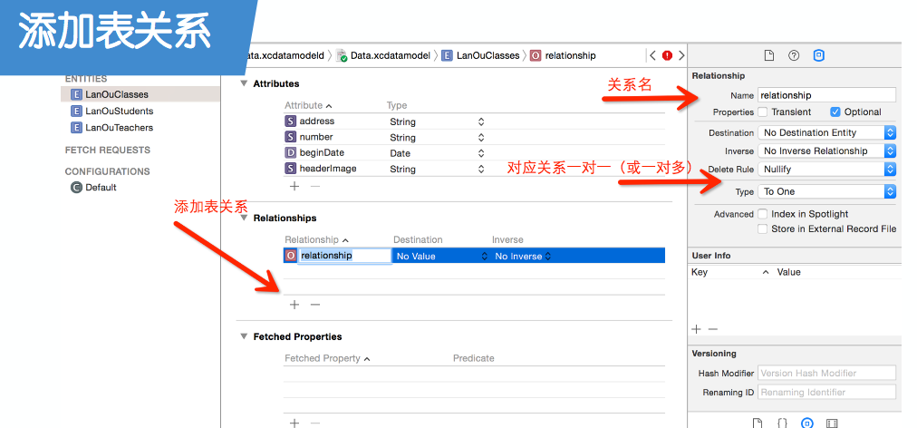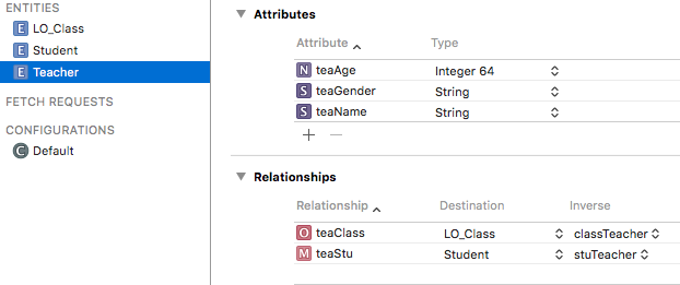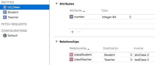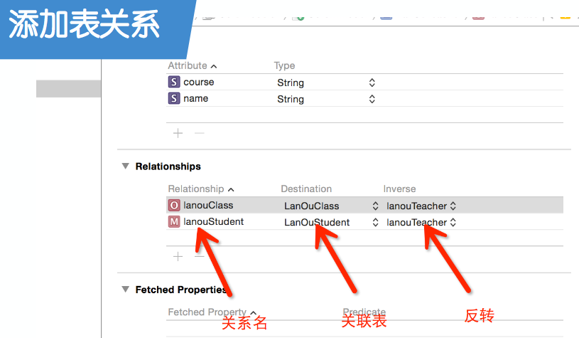 iOS基础: CoreData 数据库表关联操作 -barButtonItemClicked方法里 //Class NSEntityDescription*classDescription = [NSEntityDescriptionentityForName:@"LO_Class"inManagedObjectContext:self.objectContext]; LO_Class*myClass = [[LO_Classalloc]initWithEntity:classDescriptioninsertIntoManagedObjectContext:self.objectContext]; intnumber =arc4random() % 100; myClass.number= [NSNumbernumberWithInteger:number]; //Teacher NSEntityDescription*teacherDescription = [NSEntityDescriptionentityForName:@"Teacher"inManagedObjectContext:self.objectContext]; Teacher*teacher = [[Teacheralloc]initWithEntity:teacherDescriptioninsertIntoManagedObjectContext:self.objectContext]; teacher.teaName=@"萌萌"; teacher.teaAge= [NSNumbernumberWithInteger:18]; teacher.teaGender=@"男"; //将老师和班级建立连接 myClass.classTeacher= teacher; teacher.teaClass= myClass; //Student inta =arc4random() % 50 + 30; for(inti = 0; i < a; i++) { NSEntityDescription*studentDescription = [NSEntityDescriptionentityForName:@"Student"inManagedObjectContext:self.objectContext]; Student*student = [[Studentalloc]initWithEntity:studentDescriptioninsertIntoManagedObjectContext:self.objectContext]; student.stuName= [NSStringstringWithFormat:@"王震威%d号",i]; student.stuAge= [NSNumbernumberWithInteger:18]; NSArray*arr = @[@"男",@"女",@"王德亮"]; intgender =arc4random() % arr.count; student.stuGender= arr[gender]; //学生和班级,老师建立联系 student.stuClass= myClass; student.stuTeacher= teacher; //让班级数据和学生建立一个一对多的关系,多次进行添加 [myClassaddClassStudentObject:student]; //让老师数据和学生建立一个一对多的关系,多次进行添加 [teacheraddTeaStuObject:student]; } 总结 CoreData数据库框架的实现核心是持久化存储栈 与CoreData数据库框架的所有交互都是通过NSManagedObjectContext完成的 NSManagedObjectContext中的数据是缓存在内存中的副本,要想达到持久化目的必须更新保存 代码: #import"ViewController.h" #import"Student.h" #import"Teacher.h" #import"LO_Class.h" #import #import"AppDelegate.h" @interfaceViewController() @property(nonatomic,strong)UITableView*tableView; @property(nonatomic,strong)NSManagedObjectContext*objectContext; @property(nonatomic,strong)NSMutableArray*dataArray; @end @implementationViewController - (void)viewDidLoad { [superviewDidLoad]; self.dataArray= [NSMutableArrayarray]; [selfsetTableView]; [selfappdelegate]; [selfsearchAll]; } - (void)setTableView{ self.tableView= [[UITableViewalloc]initWithFrame:[UIScreenmainScreen].boundsstyle:(UITableViewStylePlain)]; [self.viewaddSubview:self.tableView]; self.tableView.dataSource=self; self.tableView.delegate=self; [self.tableViewregisterClass:[UITableViewCellclass]forCellReuseIdentifier:@"cell"]; self.tableView.backgroundColor= [UIColorredColor]; } -(void)appdelegate{ AppDelegate*app = (AppDelegate*)[UIApplicationsharedApplication].delegate; self.objectContext= app.managedObjectContext; self.navigationItem.rightBarButtonItem= [[UIBarButtonItemalloc]initWithBarButtonSystemItem:(UIBarButtonSystemItemAdd)target:selfaction:@selector(rightBarAction)]; } - (void)rightBarAction{ //Class NSEntityDescription*classDescription = [NSEntityDescriptionentityForName:@"LO_Class"inManagedObjectContext:self.objectContext]; LO_Class*myClass = [[LO_Classalloc]initWithEntity:classDescriptioninsertIntoManagedObjectContext:self.objectContext]; intnumber =arc4random() % 100; myClass.number= [NSNumbernumberWithInteger:number]; //Teacher NSEntityDescription*teacherDescription = [NSEntityDescriptionentityForName:@"Teacher"inManagedObjectContext:self.objectContext]; Teacher*teacher = [[Teacheralloc]initWithEntity:teacherDescriptioninsertIntoManagedObjectContext:self.objectContext]; teacher.teaName=@"萌萌"; teacher.teaAge= [NSNumbernumberWithInteger:18]; teacher.teaGender=@"男"; //将老师和班级建立连接 myClass.classTeacher= teacher; teacher.teaClass= myClass; //Student inta =arc4random() % 50 + 30; for(inti = 0; i < a; i++) { NSEntityDescription*studentDescription = [NSEntityDescriptionentityForName:@"Student"inManagedObjectContext:self.objectContext]; Student*student = [[Studentalloc]initWithEntity:studentDescriptioninsertIntoManagedObjectContext:self.objectContext]; student.stuName= [NSStringstringWithFormat:@"王震威%d号",i]; student.stuAge= [NSNumbernumberWithInteger:18]; NSArray*arr = @[@"男",@"女",@"王德亮"]; intgender =arc4random() % arr.count; student.stuGender= arr[gender]; //学生和班级,老师建立联系 student.stuClass= myClass; student.stuTeacher= teacher; //让班级数据和学生建立一个一对多的关系,多次进行添加 [myClassaddClassStudentObject:student]; //让老师数据和学生建立一个一对多的关系,多次进行添加 [teacheraddTeaStuObject:student]; } //很重要,完成save后才保存到数据库 NSError*error =nil; [self.objectContextsave:&error]; if(error ==nil) { NSLog(@"保存正确"); [self.dataArrayaddObject:myClass]; NSIndexPath*indexPath = [NSIndexPathindexPathForRow:self.dataArray.count-1inSection:0]; [self.tableViewinsertRowsAtIndexPaths:@[indexPath]withRowAnimation:(UITableViewRowAnimationFade)]; } } - (void)searchAll{ // Fetch ——CoreData 系统封装好的 NSFetchRequest*fetchRequest = [[NSFetchRequestalloc]init]; NSEntityDescription*entity = [NSEntityDescriptionentityForName:@"LO_Class"inManagedObjectContext:self.objectContext]; [fetchRequestsetEntity:entity]; //使用谓词查询,里面类似于SQL查询语句中的where条件 // LO_Class *myClass = [LO_Class new]; // NSPredicate *predicate = [NSPredicate predicateWithFormat:@"studentClass = %@", myClass]; // [fetchRequest setPredicate:predicate]; //排序(升降序) NSSortDescriptor*sortDescriptor = [[NSSortDescriptoralloc]initWithKey:@"number"ascending:YES]; [fetchRequestsetSortDescriptors:[NSArrayarrayWithObjects:sortDescriptor,nil]]; NSError*error =nil; NSArray*fetchedObjects = [self.objectContextexecuteFetchRequest:fetchRequester