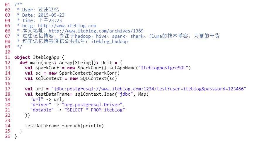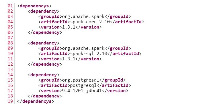 不过在Spark 1.4的版本中,这个方法已经被标记为deprecated,所以我们得调用read.format(source).options(options).load()来替代。 那么我们的代码可以这么写,代码如下所示,如图1: 在上面的代码使用中,采用的方法是直接将SQL语句直接传入到dbtable中,但很多情况下这还不符合我们的需求,可是,我们还可以通过调用registerTempTable()方法来注册临时表,并调用sql()方法执行查询,代码如下所示: 1 val testDataFrame= sqlContext.load("jdbc", Map( 2 "url" -> url, 3 "driver" -> "org.postgresql.Driver", 4 "dbtable" -> "iteblog" 5 )) 6 7 testDataFrame.registerTempTable("iteblog") 8 sqlContext.sql("select * from iteblog").foreach(println) 最后,若你使用的是SBT来管理项目,你需要在你的build.sbt文件中添加相关的依赖,代码如下所示: 1 libraryDependencies ++= { 2 "org.apache.spark" % "spark-core_2.10" % "1.3.1", 3 "org.apache.spark" % "spark-sql_2.10" % "1.3.1", 4 "org.postgresql" % "postgresql" % "9.4-1201-jdbc41" 5 } 若你使用的是Maven,请在你的pom.xml文件里面加入以下依赖,代码如下所示: 图2 本博客文章除特别声明,全部都是原创! 尊重原创,转载请注明: 转载自过往记忆(http://www.iteblog.com/) 本文链接: 【Spark SQL整合PostgreSQL】(http://www.iteblog.com/archives/1369) 上一条: Mysql的字符集设置 下一条: Mysql数据库的优化总结
