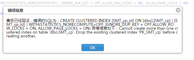 关于RDS-MSSQL创建聚簇索引需要注意的事项 1、一个表只能创建一个聚簇索引。如果之前有了聚簇索引,就会创建失败,如IDBcloud里面的报错,如下图所示: 2、删除聚簇索引的命令: DROP INDEX [$index_name] ON [$table_name]; 3、聚簇索引在IDBcloud里面看不到,如果要看,需要通过命令看。具体命令: ues dbname; sp_helpindex '$tablename' ; 4、编辑索引里面”重新计算统计信息”是什么含义: 统计信息,实际就是create index中的STATISTICS_NORECOMPUTE选项,其意思就是是否重新计算统计信息,默认值是OFF就是需要重新计算(因为该选项本身就是否定的意思no-recompute),一般来说都需要重新计算,具体可以参考链接:msdn(https://technet.microsoft.com/zh-cn/library/ms188783(v=SQL.105).aspx)。 上一条: DTS订阅不能选择RDS只读实例原因 下一条: RDS控制台tps资源监控的介绍