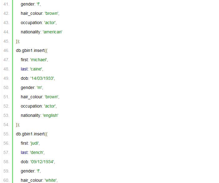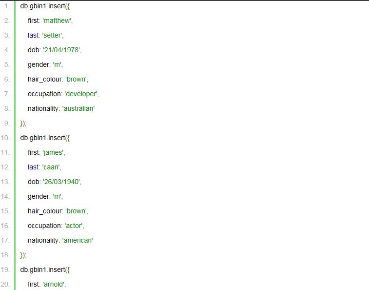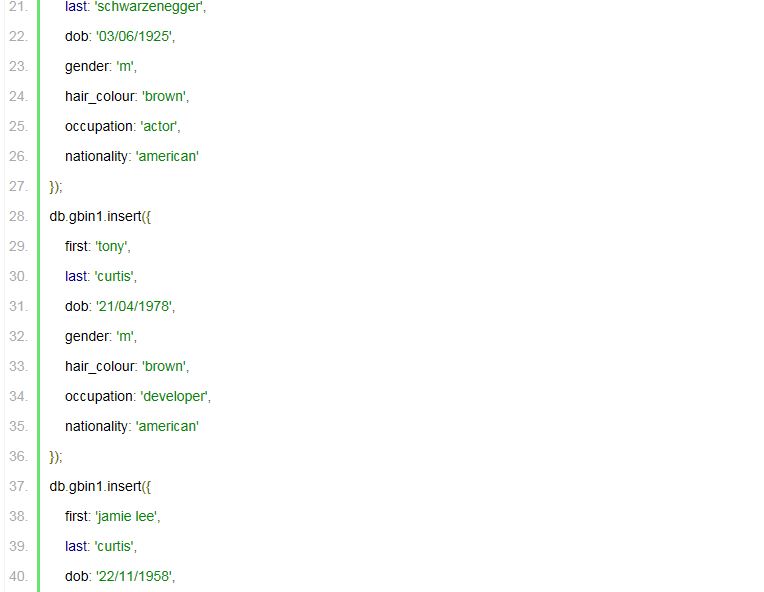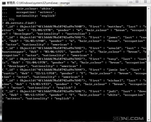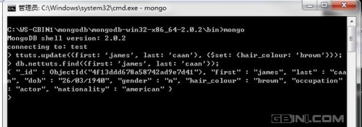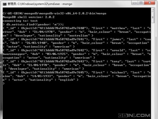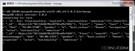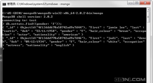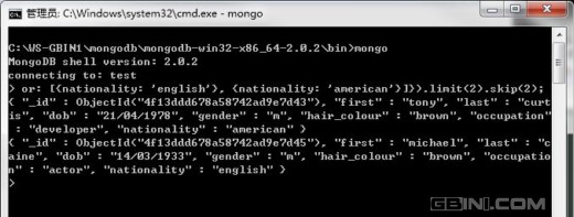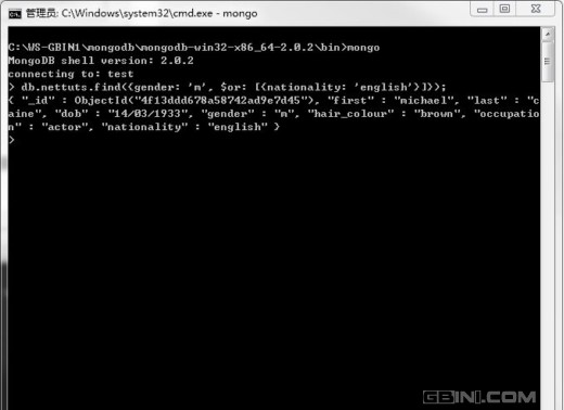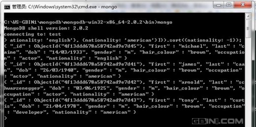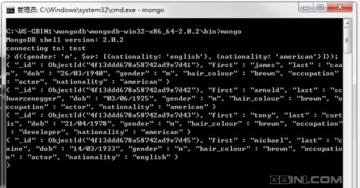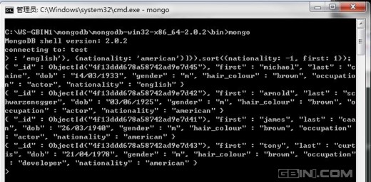 等等... 2.必须匹配的记录 比如,我们需要找到所有的女性,使用如下所示的命令: db.gbin1.find({gender: 'f'}); 查询所有的男性呢? 很简答,如下所示的代码: db.gbin1.find({gender: 'm'}); 3.多条件查询 下面所说的语句将查询男性演员或国籍是english db.gbin1.find({gender: 'm', $or: [{nationality: 'english'}]}); 若需要知道国籍为english或者american呢? 很简单,代码如下所示: db.gbin1.find({gender: 'm', $or: [{nationality: 'english'}, {nationality: 'american'}]}); 四、记录排序 使用Mongo我们需要使用sort命令来执行排序。与find命令类似,使用不同选项来设定不同排序结果 和mysql一样,我们这里升序与降序的关键字不同, 我们用下面的使用方式: 升序: -1 降序: 1 举例说以下代码: db.gbin1.find({gender: 'm', $or: [{nationality: 'english'}, {nationality: 'american'}]}).sort({nationality: -1}); 以上所说的命令将返回所有的男性,国籍为english或american,并且使用国籍的降序排列。 那么我们怎么使得国籍降序,而名字使用升序排列呢? 代码如下所示: db.gbin1.find({gender: 'm', $or: [{nationality: 'english'}, {nationality: 'american'}]}).sort({nationality: -1, first: 1}); 你可以从图12中看到Arnold Schwarzenegger在Tony Curtis后面出现 4.限制返回记录 若是一个非常大的数据集,我们想限制结果为2,那么怎么执行? Mongo提供了limit命令,类似MYSQL允许我们执行限制操作。我们使用上面的查询,但是只返回2个记录。如下所示: db.gbin1.find({gender: 'm', $or: [{nationality: 'english'}, {nationality: 'american'}]}).limit(2); 那么假如我们希望取得第三个或第四个记录,忽略前面俩个呢? 如图14所示: 你将看到头俩个被忽略了。 六、更新记录 Mongo同时也为我们提供了记录更新选项。使用find方法来查询需要更新的记录,然后执行更新。 例如我们需要更新James Caan的记录,指定头发颜色是灰色,不是褐色。那么我们执行如下所示的代码: db.gbin1.update({first: 'james', last: 'caan'}, {$set: {hair_colour: 'brown'}}); 以上所说的代码执行后,不会有任何的成功与失败的提示。你需要使用如下的代码来查看你的更新: db.gbin1.find({first: 'james', last: 'caan'}); 从以上图片中我们看到了更新 七、 删除记录 若你需要删除一个记录,你需要指定一些selector,否则你会删除全部记录。 比如我们需要删除James Caan。使用如下所示的命令: db.gbin1.remove({first: 'james', last: 'caan'}); 与更新一样,没有任何提示是否你已经成功。你需要自己查看。 db.gbin1.find({first: 'james', last: 'caan'}); 运行以上的代码应该没有记录返回。如果没有返回记录,说明这个记录已经被删除。 那么我们如何删除所有记录呢? db.gbin1.remove();db.gbin1.find(); 运行以上所示的代码你将什么记录都看不到了,说明已经删除了 八、总结: 本文我们介绍了Mongodb是什么,为什么需要Mongodb,如何安装, 如何增删查改。如果你需要了解更多,请访问mongodb主站!