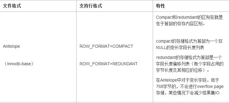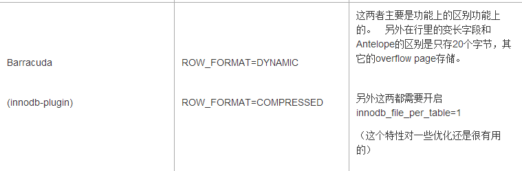Mysql数据库:Antelope 与Barracuda的区别 Antelope是innodb-base的文件格式, Barracude是innodb-plugin后引入的文件格式,同时Barracude也支持Antelope文件格式。两者区别在于: 备注: 这里有一点需要注意,如果要使用压缩,一定需要先使用innodb_file_format =Barracuda格式,不然句没有作用。 下面我们看一下区别: (testing)root@localhost [(none)]> use wubx; Database changed (testing)root@localhost [wubx]> CREATE TABLE t1 -> (c1 INT PRIMARY KEY) -> ROW_FORMAT=COMPRESSED -> KEY_BLOCK_SIZE=8; Query OK, 0 rows affected, 4 warnings (0.01 sec) 报出来4个warnings查看一下报错: (testing)root@localhost [wubx]> show warnings; +———+——+———————————————————————–+ | Level | Code | Message | +———+——+———————————————————————–+ | Warning | 1478 | InnoDB: KEY_BLOCK_SIZE requires innodb_file_format > Antelope. | | Warning | 1478 | InnoDB: ignoring KEY_BLOCK_SIZE=8. | | Warning | 1478 | InnoDB: ROW_FORMAT=COMPRESSED requires innodb_file_format > Antelope. | | Warning | 1478 | InnoDB: assuming ROW_FORMAT=COMPACT. | +———+——+———————————————————————–+ 4 rows in set (0.00 sec) 从以上报错可以看出来不支持压缩。但看一下表结构如下所示: (testing)root@localhost [wubx]> show create table t1; +——-+———————————————————————————————————————————————–+ | Table | Create Table | +——-+———————————————————————————————————————————————–+ | t1 | CREATE TABLE t1 ( c1 int(11) NOT NULL, PRIMARY KEY (c1) ) ENGINE=InnoDB DEFAULT CHARSET=utf8 ROW_FORMAT=COMPRESSED KEY_BLOCK_SIZE=8 | +——-+———————————————————————————————————————————————–+ 1 row in set (0.00 sec) 这个是比较坑的地方,所以在使用压缩需要注意。 (testing)root@localhost [wubx]>create table t2 ( c1 int(11) NOT NULL, primary key(c1)); (testing)root@localhost [wubx]> insert into t2 select * from t1; Query OK, 5417760 rows affected (37.12 sec) Records: 5417760 Duplicates: 0 Warnings: 0 创建支持压缩的表: (testing)root@localhost [wubx]>SET GLOBAL innodb_file_per_table=1 (testing)root@localhost [wubx]>SET GLOBAL innodb_file_format=Barracuda; (testing)root@localhost [wubx]>CREATE TABLE t3 (c1 INT PRIMARY KEY) ROW_FORMAT=COMPRESSED KEY_BLOCK_SIZE=8; (testing)root@localhost [wubx]> insert into t3 select * from t1; Query OK, 5417760 rows affected (1 min 10.98 sec) Records: 5417760 Duplicates: 0 Warnings: 0 看一下表的物理大小如下: -rw-rw—- 1 mysql mysql 8.4K Jul 5 16:58 t1.frm -rw-rw—- 1 mysql mysql 136M Jul 5 19:40 t1.ibd -rw-rw—- 1 mysql mysql 8.4K Jul 5 19:43 t2.frm -rw-rw—- 1 mysql mysql 136M Jul 5 19:44 t2.ibd -rw-rw—- 1 mysql mysql 8.4K Jul 5 19:46 t3.frm -rw-rw—- 1 mysql mysql 96M Jul 5 19:47 t3.ibd 可见t1, t2都没进行压缩, t3是支持压缩的。 下一条: NoSQL与SQL 的区别