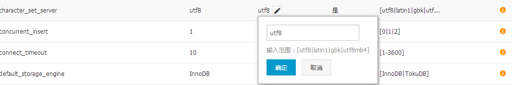 怎样通过RDS控制台修改MySql数据库编码 如果想要修改RDS Mysql数据库的编码,我们可以登陆rds控制台https://rdsnew.console.aliyun.com,依次进入实例列表-->管理-->参数设置,通过ctrl+F搜索“character_set_server”,找到character_set_server点击修改按钮即可完成修改。具体界面如下图: 如问题还未解决,请联系售后技术支持。