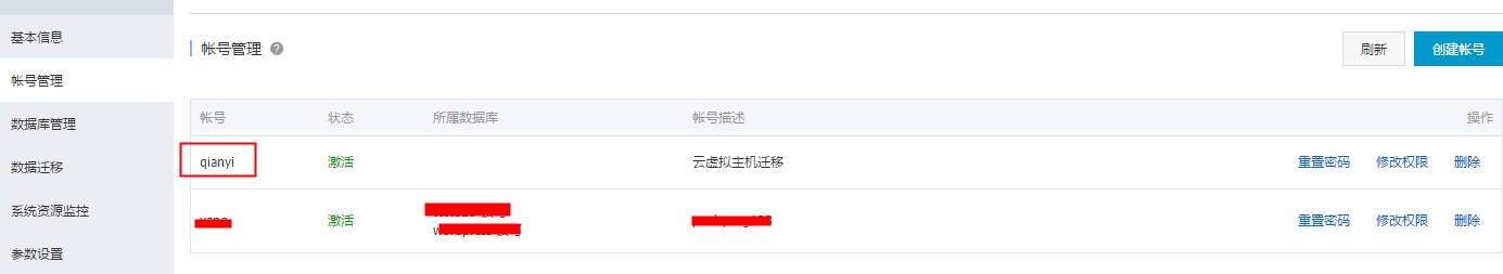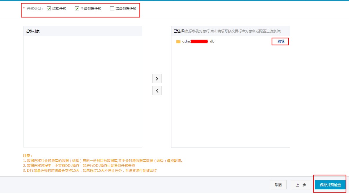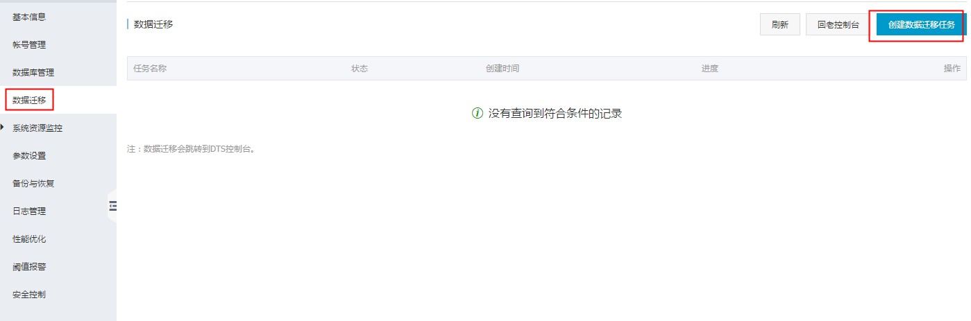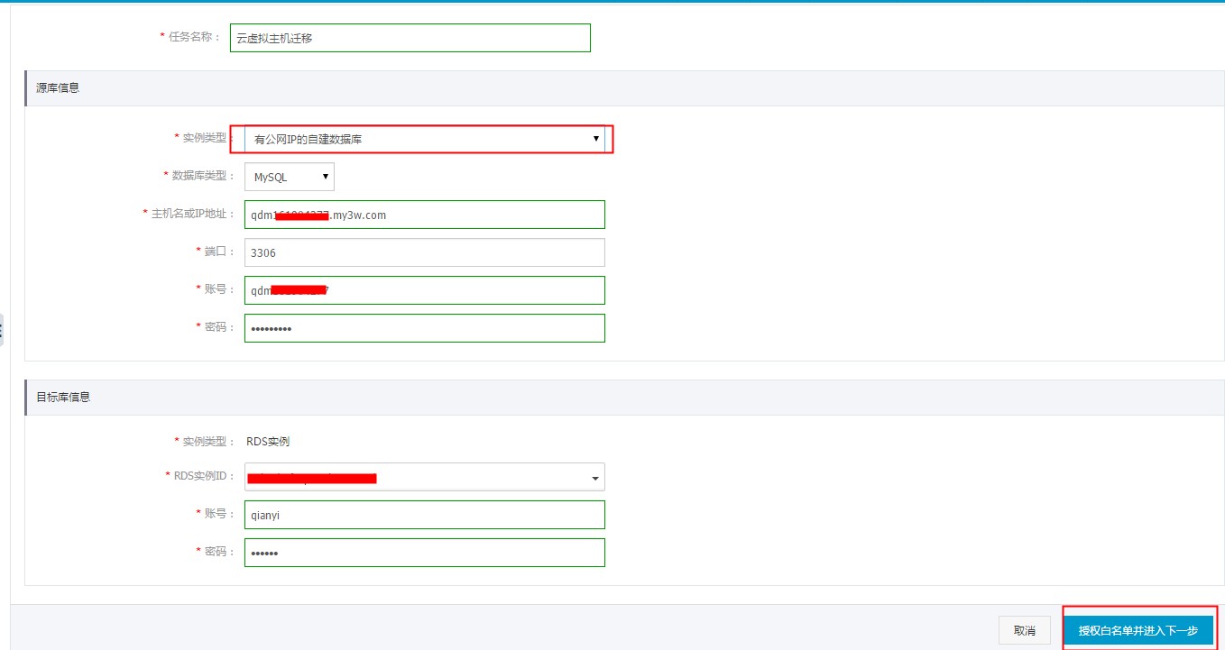 如何能够通过DTS迁移虚拟主机数据库到RDS 进入RDS控制台实例列表,按如下步骤操作: 1 点击【账号管理】--【创建账号】,如下图所示: 2 选择【数据迁移】--创建【在线数据迁移任务】,如下图所示: 3 任务名称可以按照格式随意填写,实例类型选择【有公网ip的自建数据库】,如下图所示: 填写源库的数据库地址,账号和密码,选择目标库的实例ID,填写刚刚创建好的数据库用户名和密码,点击【授权白名单并进行下一步】 4 选择好【迁移类型】 ,此处的编辑可以对数据库名称修改,如果不修改,默认迁移过去后,RDS里面的数据库名称不变,如果改为aaa,则迁移过去后RDS里面的数据库名称会变成aaa,源库不会受到任何影响。如下图所示: 5 预检查完毕后,点击【启动】,如下图所示: 6 迁移完毕后会有进度显示,之后也可以点击【查看迁移详情】,可以看到迁移后的表,视图等,如下图所示: 如果问题还未能解决,请联系售后技术支持。 上一条: 查看RDS的sql操作具体详情 下一条: RDS 一键清除binlog的方法