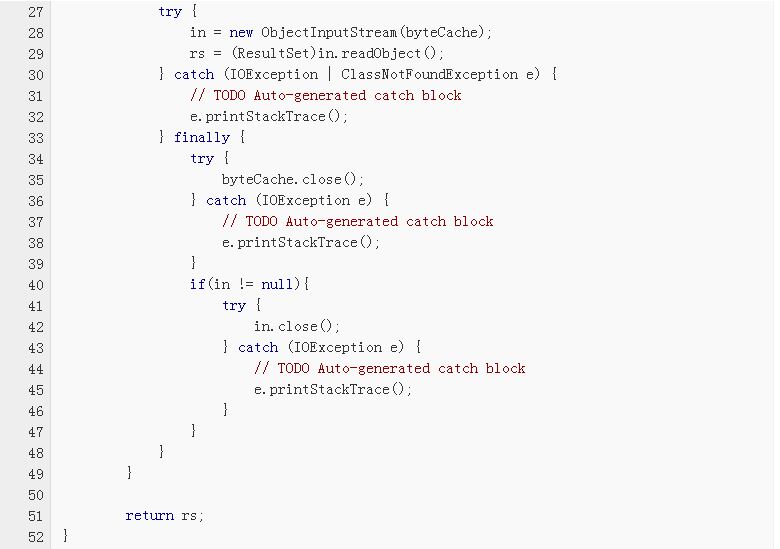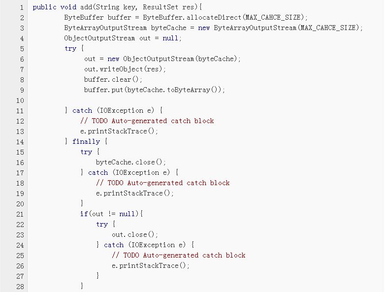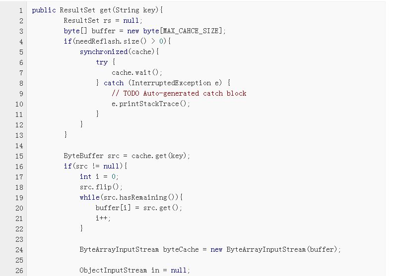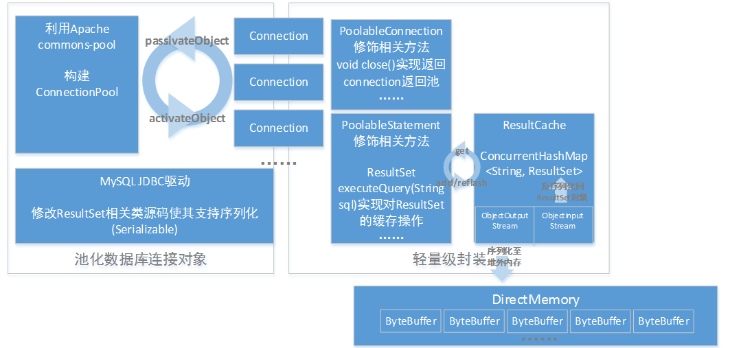 支持连接池与结果集缓存的MySQL数据库JDBC通用框架的轻量级封装(一) 图1 结构图 一、数据库连接池构建方法 下面介绍了3种方法: 1、通过继承BasePooledObjectFactory类,利用Apache的Commons Pool实现了一个PoolableConnectionFactory类,实现了将JDBC数据库连接Connection对象包裹为一个PooledObject,并且通过create()方法实现创建Connection对象,利用重载passivateObject、destroyObject等方法来控制Connection对象在从连接池取出、到返回连接池、再到最终被销毁的整个生命周期的一些细节。代码片段已给出,如图1所示: 2、通过继承GenericObjectPool类实现一个ConnectionPool类,构造函数中的工厂类参数指向上述所构建的PoolableConnectionFactory对象; 3、提供一个单例模式的管理类ConnectionPoolManager,使得获取到的连接池对象唯一,代码片段已给出,如图2所示: 图2 二、通用方法的封装方式 以下给出了2中封装方式: 1、为了使最终利用该框架进行MySQL数据库开发的开发者在使用该框架时,只需通过简洁配置后,便可透明地使用数据库连接池和结果集缓存特性,需要对JDBC相关方法进行进一步封装,封装采用类装饰器的模式的方式,如建立PoolableConnection类,在构造函数中从连接池中取得一个Connection对象,代码片段已给出,如图3所示: 图3 其他主要的方法与Connection类保持一致,这样可以保证对开发者透明,代码片段已给出,如图4所示: 图4 另外,重点关注点是需要进行装饰的方法,如close()方法,当使用该方法时并不是要关闭Connection对象,而是需要将其返回到连接池中,代码片段已给出,如图5所示: 图5 2、为了实现结果集缓存,需要按上述封装思路,进一步构建如PoolableStatement和PoolablePreparedStatement类,以PoolableStatement类举例,PoolableStatement对象由PoolableConnection类中的createStatement方法产生,但实际的Statement对象是在PoolableStatement类的构造函数中由真正的Connection对象产生的,代码片段已给出,如图6所示: 图6 同样重点关注需要进行装饰的方法,如executeQuery(String sql)方法,当使用该方法时需要先通过sql参数生成key,利用key搜索缓存中是否已经缓存了对应的查询结果集,如果存在,就不需要对数据库进行物理查询,只需要从缓存中返回该结果集;如果不存,再进行物理查询,并对返回结果集创建新的缓存,代码片段已给出,如图7所示: 图7 以此类推,实现execute相关的各类方法,另外需要特别说明的一点是在进行非查询SQL时,当涉及的表格存在于缓存中时,需要锁住缓存,并刷新结果集,刷新策略可以采用立即方式或惰性方式。 三、结果集缓存设计和实现 1.结果集缓存实际是一个ConcurrentHashMap对象,ByteBuffer在JVM堆外空间申请了一片内存存储着被序列化的ResultSet对象,这是一种非常有效的内存利用方式,但需要对MySQL JDBC驱动的源代码进行修改,从而实现ResultSet对象及其内部需要被序列化的复杂对象支持序列化(Serializable),但是这种序列化是有策略的,为了节省内存空间,也将对ResultSet对象内部无需序列化的对象前添加transient关键字,一个典型的结果集缓存创建,代码片段已给出,如图8所示: 图8 2、接下来需要构建ResultSetCache类,对缓存实现控制方法,典型的包括增加一条缓存、取出一条缓存、清空缓存,当缓存达到容量和条数限制时的策略方法等,增加一条缓存代码片段已给出,如图9所示: 图9 取出一条缓存的参考代码片段已给出,如图10所示: 图10 四、框架的使用 框架使用代码片段已给出,如图11所示: 图11 从使用中可以看到达到了对开发者的框架内部实现细节的透明,开发者几乎不用了解任何数据库连接池和结果集缓存的细节。 五、该框架需要关注的技术细节 以下给出了2种技术细节: 1、ResultSet序列化问题:MySQL JDBC驱动中的ResultSet类以及相关复杂对象都是不支持序列化的,导致无法实现将ResultSet对象保持状态地序列化到一个JVM堆外内存空间中;解决方案是修改MySQL JDBC驱动源代码,对相关对象进行了序列化处理,但目前的处理细致性还不够,需要进一步分析进行精细控制; 2、非查询操作锁缓存问题:为了保持数据库的事务完整性要求,需要在处理非查询操作的SQL执行时锁住缓存,在处理完操作后,删除原来带有脏数据的缓存,并根据策略更新缓存;解决方案是目前在任何非查询操作的SQL执行时都会对整个缓存加锁,且全部查询操作都会等待解锁通知后才可以完成操作,当前的处理比较粗糙,需要进行对被操作表的提取,只对涉及到的表的查询进行锁等待。 上一条: MySQL数据库的优化 下一条: MySQL的数据库引擎