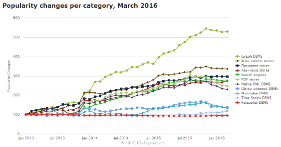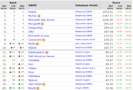 DB-Engines 2016年3月数据库排名 DB-Engines排行榜排出了目前最聚人气的数据库管理系统,这个排行榜分析了市场上200多个不同类型的数据库。它的排行规则是根据它们在Google和Bing上搜索出的结果数目、Google Trends上的搜索次数、Indeed上的职位数目、LinkedIn中提到的次数、Stackoverflow上的提问和回复的数量,这五大因素作为依据所排出的最新榜单。 根据榜单可知,处于榜首的数据库依旧是Oracle,其次就是MySQL与Microsoft SQL Server 分别位居二三两名。由此可以看出,它们三个数据库以绝对的优势霸占着市场中最多的用户。直至本月,在前十名当中,排名有最大变化的是Redis,它已经成功超越SQLite,现在据第9位。在前二十名中,Elasticsearch、HBase、Neo4j在三月份都有所上升。如下图所示: 在排行的前20名数据库系统中,包含了传统关系型数据库与NoSQL系统。不难发现,排名靠前的数据库都是被传统关系型数据库所霸占的,但是在前20名以外的前100名中,绝大多数依然是以NoSQL数据库占主导,MongoDB很显然成为了当今最流行的文件存储数据库,并且NoSQL数据库将会在以后越来越普及。 下图是每个数据库人气度的变化趋势: 从上图中可看出,除了传统关系型数据库无明显的变化幅度,在NoSQL系统中都有明显的变化。DB-Engines排行榜每月会更新一次,其中NoSQL系统占据前十的席位虽然很少,但是我们从目前的流行趋势可以预想到,在将来NoSQL系统的人气将会变得越来越高。 上一条: 8 个 MySQL 陷阱 下一条: MySQL 的基本操作