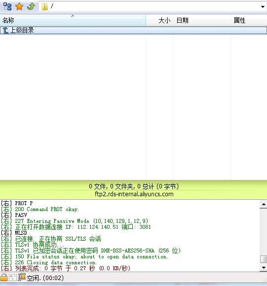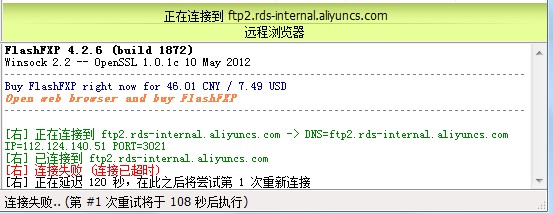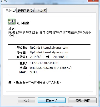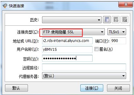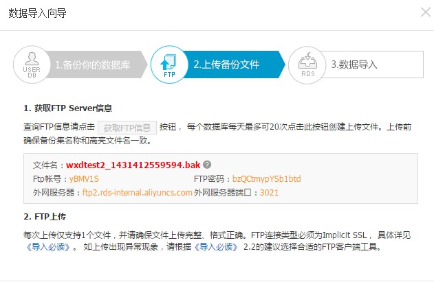 RDS控制台迁移SQL server数据库,获取的FTP无法登录的原因及解决 在RDS控制台上,对SQL server数据库进行数据迁移时,在“数据导入向导"中获取到的FTP登入信息,无法登录到FTP上进行数据上传,FTP息获取界面如下图所示: 通过上面获取到的信息无法登录FTP,报连接超时。这里使用FLASHFTP工具测试的,报错信息如下图所示: 很可能是因为连接类型使用了默认的,所以FTP登入不了,需要修改为“FTP使用隐藏SSL”,如下图所示: 点击连接以后会提示相关的证书信息,点接受一次,然后就可以直接登入成功了,如下图所示: 如果问题还存在,请联系阿里云售后支持。 上一条: RDS 一键清除binlog的方法 下一条: 怎样排查RDS磁盘空间利用率是否过多