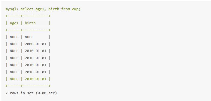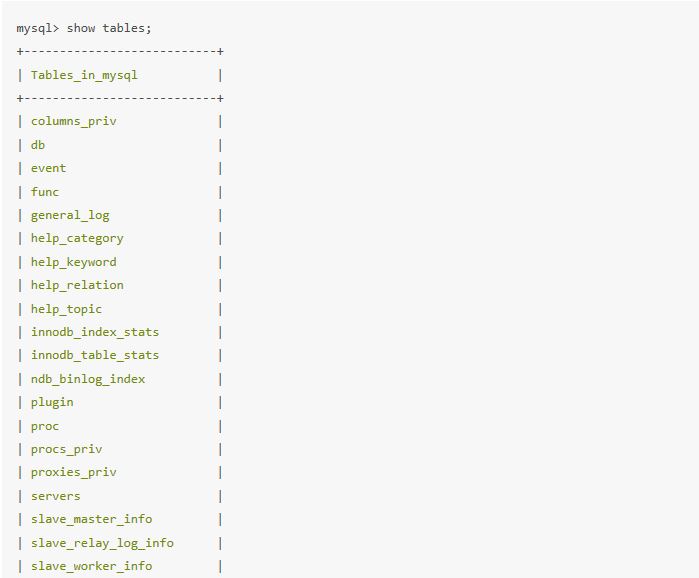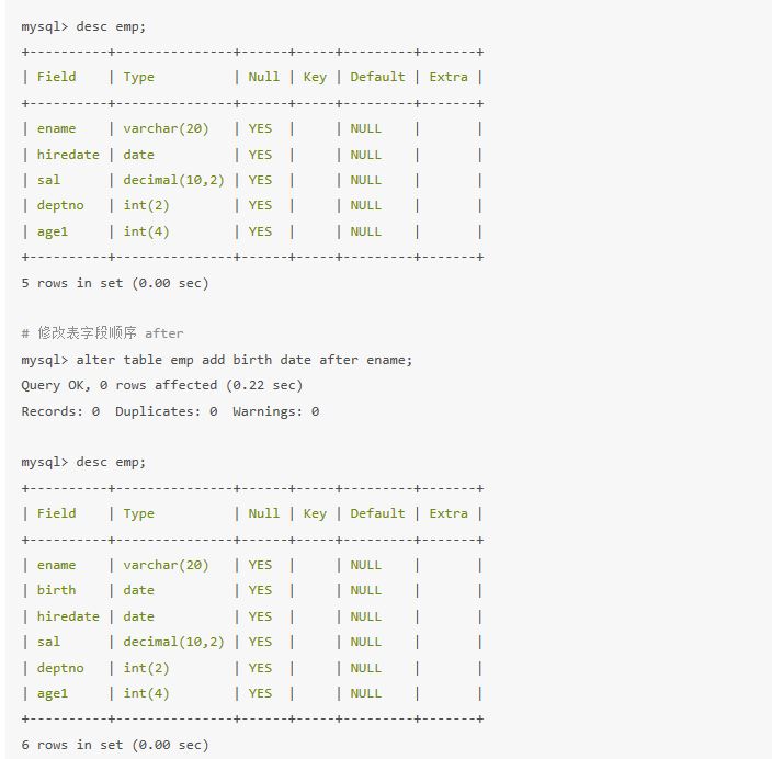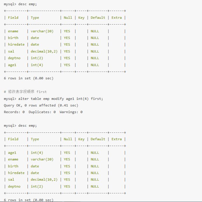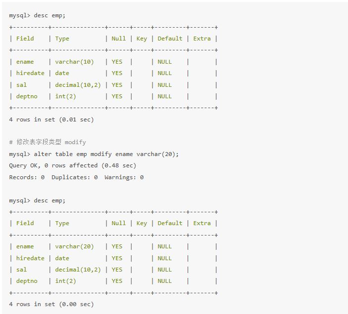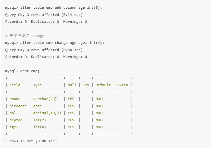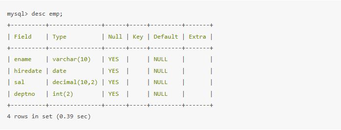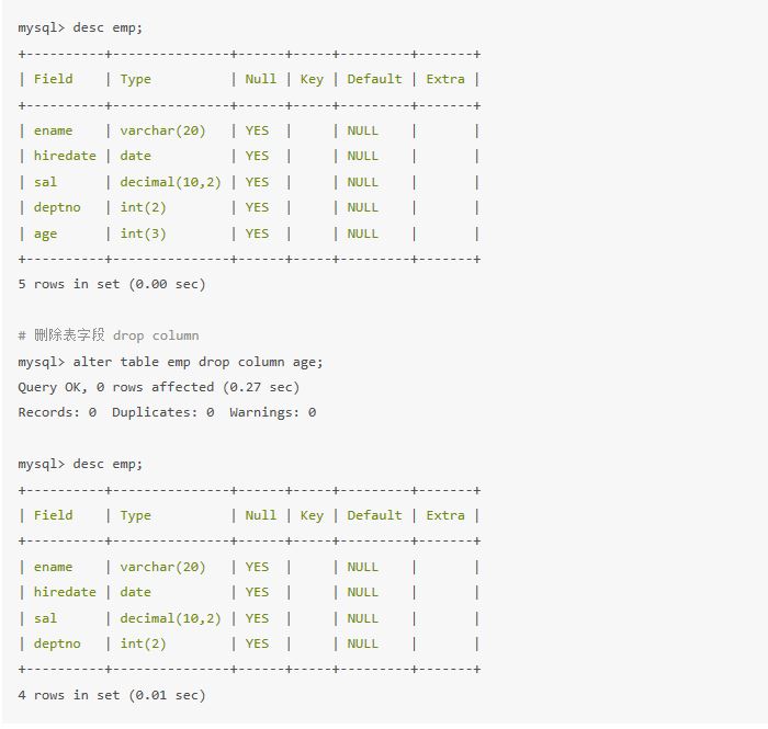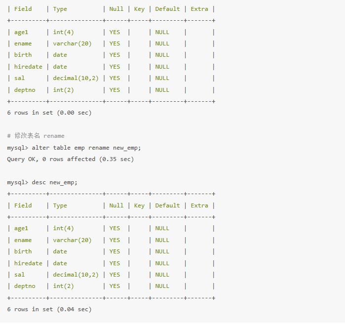 回车之后,输入密码,密码输入时的字符是不可见的,输完密码直接回车登录。 如果没有什么别的问题,登陆成功之后会出现以下所示的内容: ➜ ~ mysql -u root -p Enter password: Welcome to the MySQL monitor. Commands end with ; or \g. Your MySQL connection id is 7 Server version: 5.6.25 MySQL Community Server (GPL) Copyright (c) 2000, 2015, Oracle and/or its affiliates. All rights reserved. Oracle is a registered trademark of Oracle Corporation and/or its affiliates. Other names may be trademarks of their respective owners. Type 'help;' or '\h' for help. Type '\c' to clear the current input statement. mysql> mysql> 表示等待输入指令。最后一行的意思是,通过 ‘help;’ 或者 ‘\h’ 命令来显示帮助内容,通过 ‘\c’ 命令来清除命令行buffer。 二、DDL语句 DDL为数据定义语言,简单来说,就是对数据库内容的对象进行创建、修改、删除和操作语言,它与DML最大的区别在于DML是对表内部数据的操作,不涉及表的定义、结构的修改,也不涉及其他对象。 1.创建数据库 mysql> create database test; Query OK, 1 row affected (0.00 sec) “Query OK” 表示上面的命令执行成功,所有的 DDL 与 DML(不包 括 SELECT)操作执行成功后都显示“Query OK”,这里理解为执行成功就可以了;“1 row affected” 表示操作只影响了数据库中一行的记录,“0.00 sec”则记录了操作执行的时间。 如果已经存在这个数据库,系统会出现如下所示的: mysql> create database test; ERROR 1007 (HY000): Can't create database 'test'; database exists 2.查看数据库 如下面所示的代码: 图1 3.选中数据库 mysql> use test; Database changed 根据以上的代码,这样就进入到了 test 数据库中了。当然你可以使用 use 语句随时切换要操作的数据库,刚刚选中了 test ,现在我们切换到mysql内容的 mysql 数据库看看,如以下所示: mysql> use mysql; Reading table information for completion of table and column names You can turn off this feature to get a quicker startup with -A Database changed 出现 ” Database changed“ 表示切换成功。然后,看看 mysql数据库里面有什么内容(和查看当前数据库服务器数据库一样使用 show 语句): 这些表里面的内容是关系数据库服务器相关的权限、用户、数据库状态、设置等相关的信息数据。 4.删除数据库 mysql> drop database test; Query OK, 0 rows affected (0.01 sec) 说明:数据库删除后,下面的所有数据都会全部删除,所以删除前一定要慎重并做好相应的备份。 5.创建表 代码如下所示: mysql> create table emp( ename varchar(10), hiredate date, sal decimal(10,2), deptno int(2) ); Query OK, 0 rows affected (0.63 sec mysql> create table dept( deptno int(4), deptname varchar(20)); Query OK, 0 rows affected (0.12 sec) 6.查看表字段结构信息 如下所示: 图3 7.查看表的创建SQL语句 代码如下所示: mysql> show create table emp \G; *************************** 1. row *************************** Table: emp Create Table: CREATE TABLE `emp` ( `ename` varchar(10) DEFAULT NULL, `hiredate` date DEFAULT NULL, `sal` decimal(10,2) DEFAULT NULL, `deptno` int(2) DEFAULT NULL ) ENGINE=InnoDB DEFAULT CHARSET=latin1 1 row in set (0.00 sec) ERROR: No query specified 上面表的创建 SQL 语句中,除了可以看到表定义以外,还可以看到表的 engine(存储引擎) 和 charset(字符集)等信息。“\G”选项的含义是使得记录能够按照字段竖着排列,对于内 容比较长的记录更易于显示。 8.删除表 代码如下所示: mysql> drop table emp; Query OK, 0 rows affected (0.34 sec) 9.修改表 9.1修改表字段类型 代码如下所示: 图4 9.2删除表字段 代码如下所示: 图5 9.3表字段改名 代码如下所示: 图6 9.4修改表字段排列顺序 在前的字段增加与修改语句(add/change/modify)中,最后都可以加一个可选项 first|after column_name,这个选项可以用来修改字段在表中的位置,默认add增加的新字段加在表的最后,change/modify不会改变字段位置。下例将新增能加的字段放在第二位,如下所示: 图7 修改字段 age,将它放在最前面,如下所示: 图8 9.5修改表名 如下所示: 图9 10.DML语句 DML操作是指对数据中表记录的操作,主要包括以下内容: