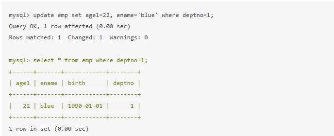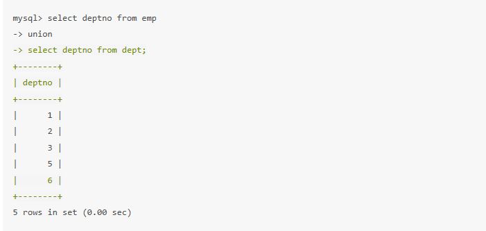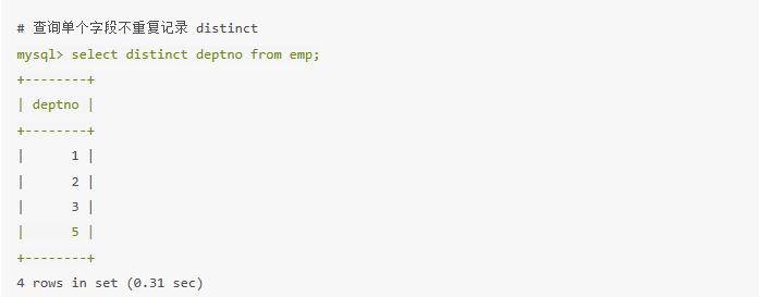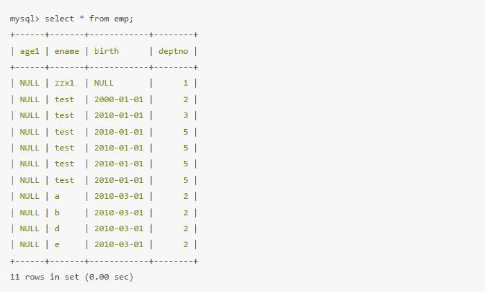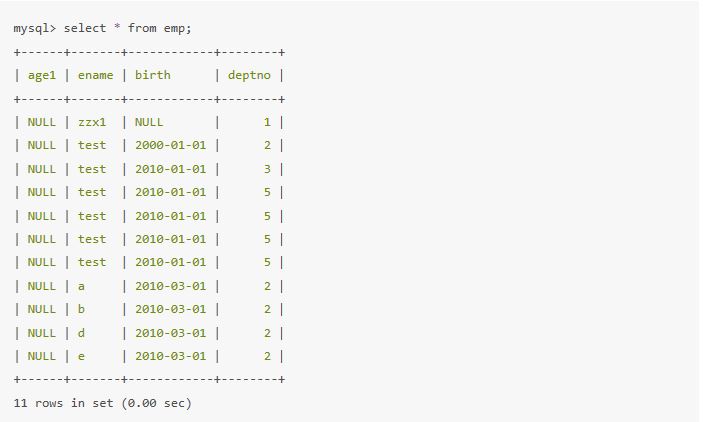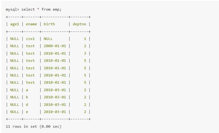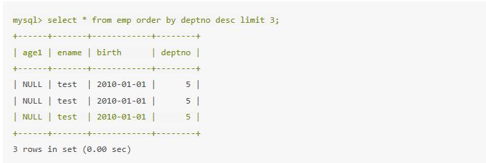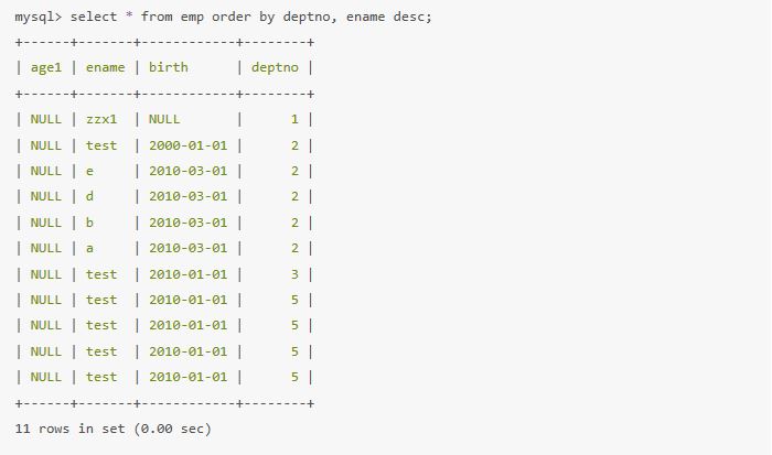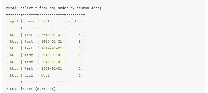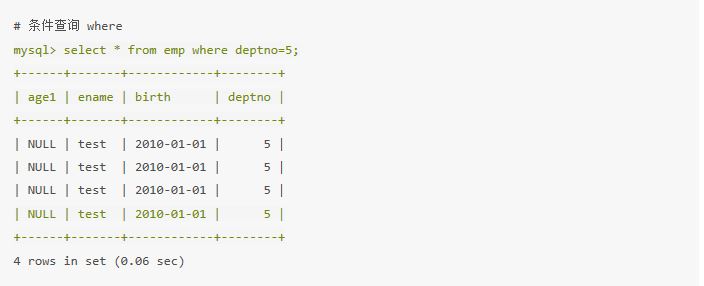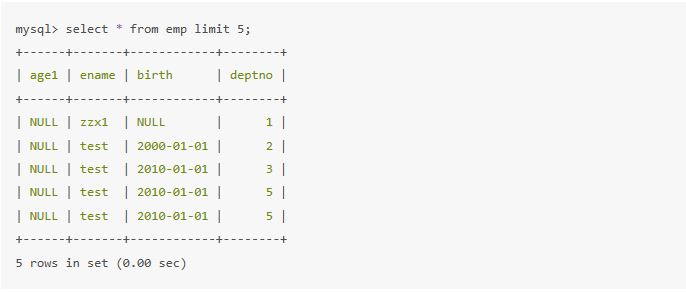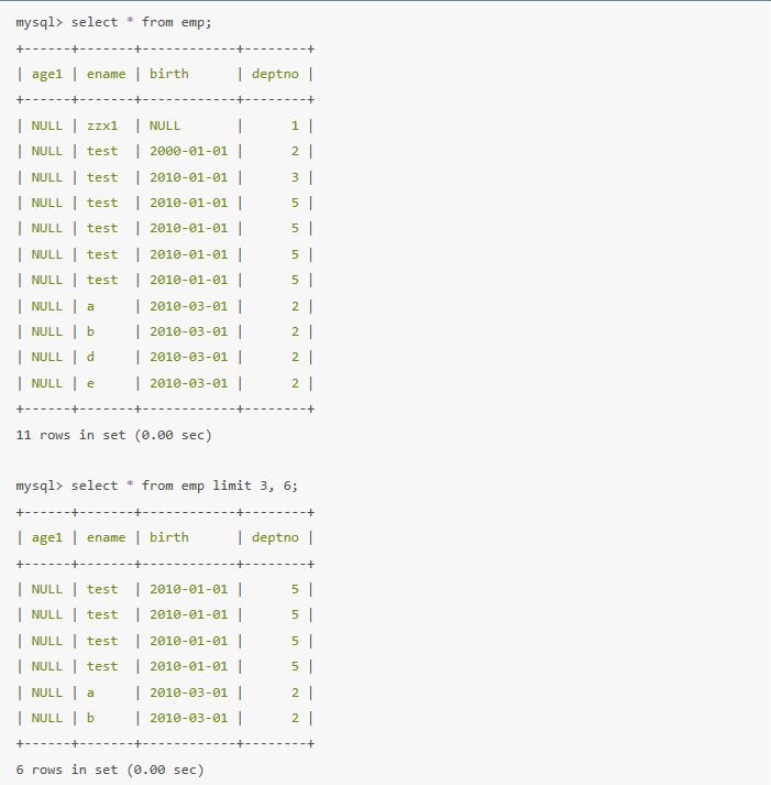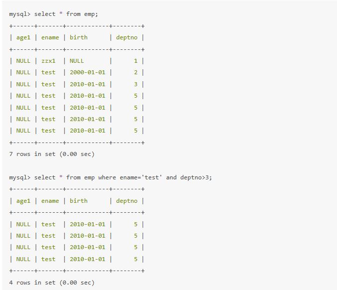 11.插入记录 如下所示: mysql> insert into emp (ename,hiredate,sal,deptno) values('zzx1','2000-01-01','2000',1); Query OK, 1 row affected (0.08 sec) 也可以不指定字段名称,但是 values 后面的顺序应该和字段的排序一致,如下所示: 图10 当然,你也可以一次插入对条记录,各条语句之间使用都好隔开,如下所示: mysql> insert into emp -> values(null, 'test', '2010-01-1', 5), -> (null, 'test', '2010-01-1', 5), -> (null, 'test', '2010-01-1', 5), -> (null, 'test', '2010-01-1', 5); Query OK, 4 rows affected (0.31 sec) Records: 4 Duplicates: 0 Warnings: 0 12、查询记录 12.1基础查询 如下所示: 图11 ”*” 是一种正则表达式的写法,表示匹配所有,上面的查询语句和下面的是等价,如下所示: 图12 12.2查询指定的字段 图13 12.3条件查询 图14 结果集中将符合条件的记录列出来。上面的例子中,where 后面的田间是一个字段的 ‘=’ 比较,除此之外,还可以使用>、<、>=、<=、!=等比较运算符;多个条件还可以使用 or 、 and 等逻辑运算符进行多条件联合查询,运算符后面再说。下面是一个使用多字段条件查询的例子,如下所示: 图15 13.结果集排序 在 select 出来之后的结果集中排序使用 order by ,其中 desc 和 asc 是排序顺序中的关键字。desc 表示按照字段进行降序排列,asc 表示升序排列,如果不写关键字默认升序排列。如下所示: 图16 order by 后面可以跟多个不同的字段排序,并且排序字段的不同结果集的顺序也不同,如果排序字段的值一样,则值相同的字段按照第二个排序字段进行排序。如下所示: 图17 如果只有一个排序字段,则字段相同的记录将会无序排列。 图18 14.结果集限制 对于查询或者排序后的结果集,如果希望只显示一部分而不是全部,使用 limit 关键字结果集数量限制。如下面所示的5条记录: 图19 堆排序的结果集限制,如下所示: 图20 在结果集中取一个区间,这个功能经常用来记录的分页显示,如下所示: 图21 注:limit数据MySQL扩展SQL92后的语法,在其他数据库并不能通用。 15.聚合 使用聚合操作进行一些汇总操作,比如统计整个公司的人数或者统计每个部门的人数。聚合操作语法如下所示: SELECT [field1,field2,......fieldn] fun_name FROM tablename [WHERE where_contition] [GROUP BY field1,field2,......fieldn [WITH ROLLUP]] [HAVING where_contition] 下面所说的是聚合所需要使用的参数关键字: