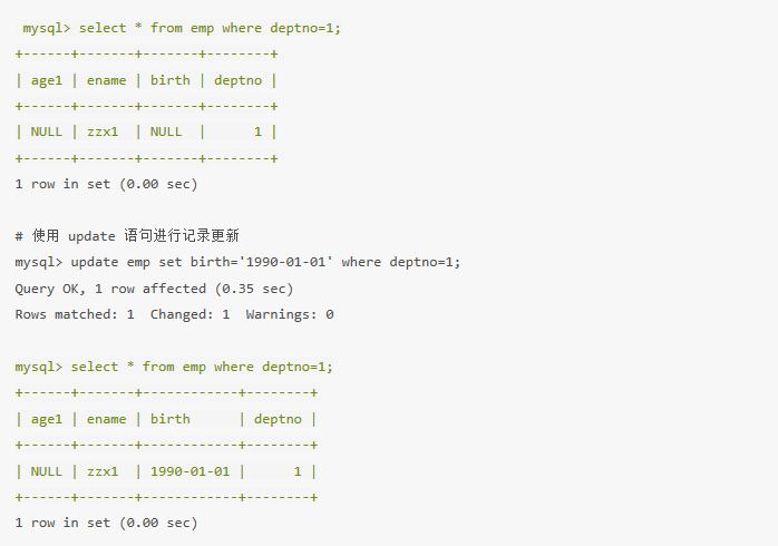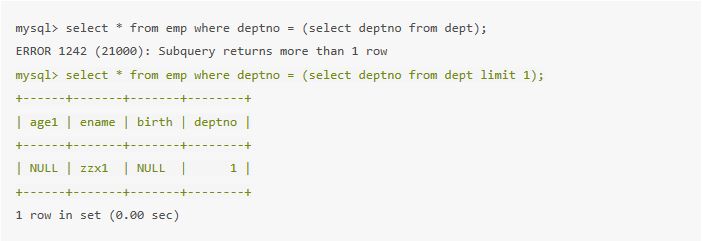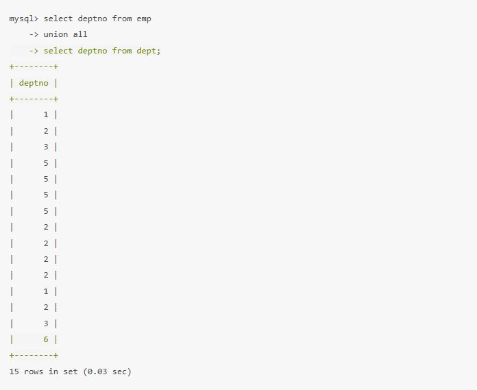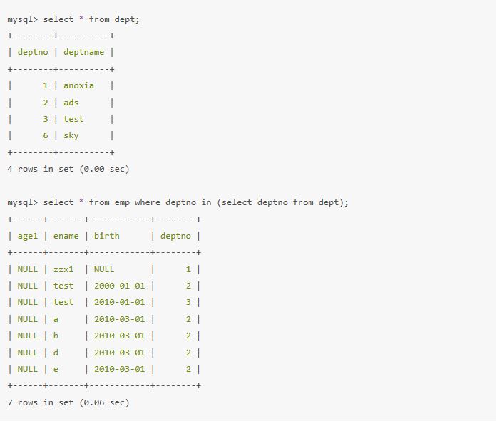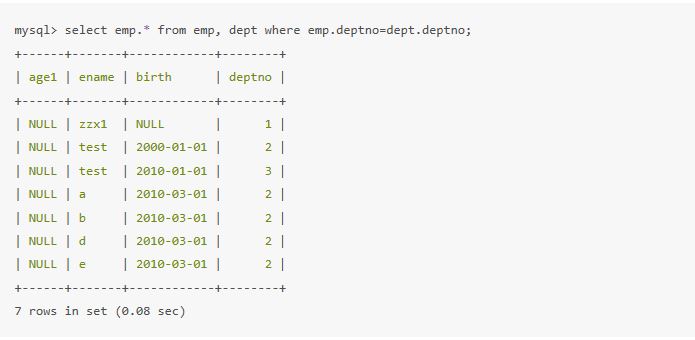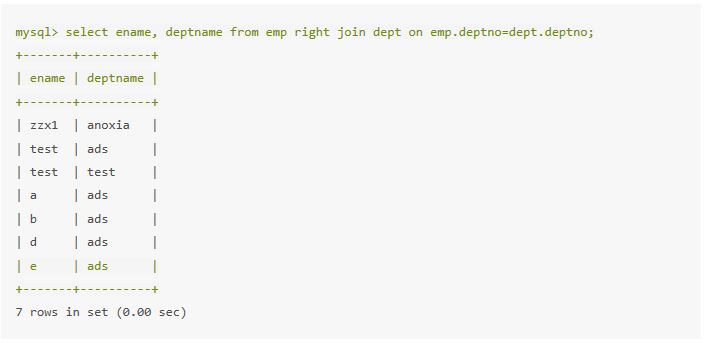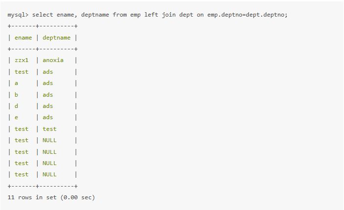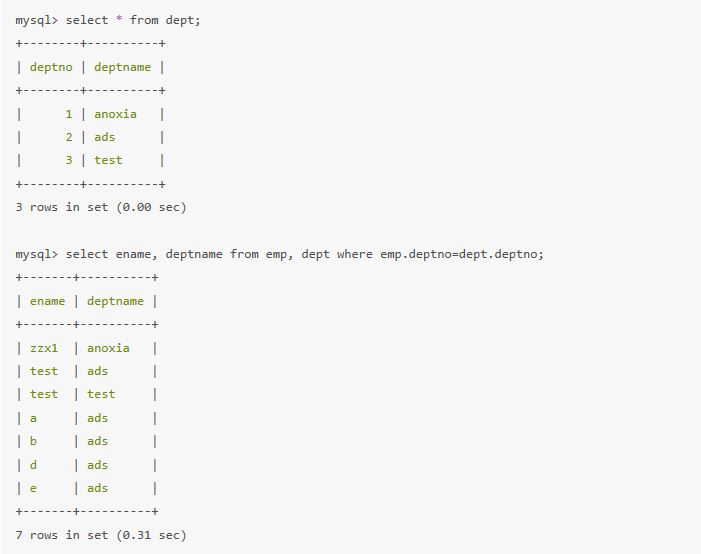 count(1) 中的’1’表示按照第一个字段统计。下面看看统计的另一种情况,当 count 括号中为 ‘null’ 会是什么情况? 如下所示 图23 结果出现了 0 ,这个说明当括号中为null时,忽略所有字段为空的记录。想了解更多原因,请百度。 group by 统计分组(分类)各总数, 如下所示: 图24 with rollup 在上面的基础上统计总数,如下所示: 图25 having 统计人数大于2的分类,如下所示: 图26 sun、max、min 统计累加、最高与最低: 图27 16.表连接 当需要查询多个表中的字段时,就可以使用表连接来实现。表连接分为内连接和外连接,他们之间最主要的区别是内连接仅选出两张表中相互匹配的记录,而外连接会选出其他不匹配的记录。我们常用的十内连接。 16.1内连接 图28 16.2外连接 外连接又分为左连接和右链接,具体定义如下所示: 左连接:包含所有的左边表中的记录甚至是右边表中没有和它匹配的记录 图29 右连接:包含所有的右边表中的记录甚至是右边表中没有和它匹配的记录 图30 17.子查询 有时候,当我们查询的时候,需要的条件是另外一个select语句的结果,这时就需要使用子查询。用于子查询的关键字包括in、not in、=、!=、exists、not exists等。 图31 如果子查询记录数唯一,可以用 = 代替 in: 图32 某些情况下,子查询可以转化为表连接如下所示: 图33 18.记录联合 使用 union 与 union all 关键字,将两个表的数据按照一定的查询条件查询出来后,将结果合并到一起显示。两者主要的区别是把结果直接合并在一起,而 union 是将 union all 后的结果进行一次distinct,去除重复记录后的结果。 图34 17.更新记录 图35 18.修改多个字段 图36 同时对两个表进行更新: mysql> update emp a,dept b set a.sal=a.sal*b.deptno,b.deptname=a.ename where a.deptno=b.deptno; Query OK, 3 rows affected (0.04 sec) Rows matched: 5 Changed: 3 Warnings: 0 删除记录 # 使用 delete 删除记录 mysql> delete from emp where ename='a'; Query OK, 1 row affected (0.08 sec) 关联删除,如下所示: mysql> delete emp, dept from emp, dept where emp.deptno=dept.deptno and emp.deptno=2; Query OK, 6 rows affected (0.03 sec) DCL语句 创建库用户 # 创建数据库用户 anoxia ,具有对test数据库中所有标的 select / insert 权限 mysql> grant select, insert on test.* to 'anoxia'@'localhost' identified by '4311'; Query OK, 0 rows affected (0.00 sec) 移除权限,如下所示: mysql> revoke insert on test.* from 'anoxia'@'localhost'; Query OK, 0 rows affected (0.30 sec)