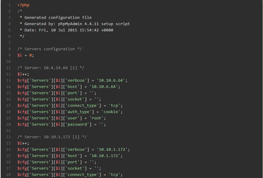 1.方法一 phpMyAdmin允许定义输入的MySQL服务器IP地址,用户名与密码,如下所示: 修改/libraries/config.default.php为真即可,简单安全省事 图2 2.方法二 phpMyAdmin修改config.inc.php,服务器地址为下拉列表可选登录多个服务器,如下所示: 增加config.sample.inc.php文件,参考下面所示的配置或者访问setup手动生成 图3