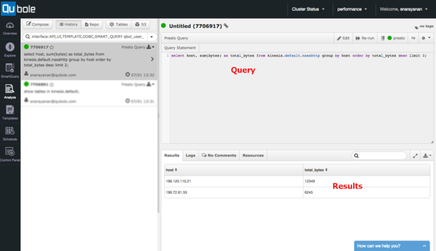 用Presto-Amazon Kinesis连接器实现流数据交互式查询 Amazon Kinesis是一项可伸缩的,完全托管业务,可以流化大规模的分布式数据集。随着各种应用开始收集越来越多的数据,Amazon Kinesis正在成为将数据摄入AWS的起始点。但所有那些数据只有在其可以被分析并用来影响商业决策时才是有用的。很多解决方案由于以各种方式处理数据而可以消耗Kinesis流,但是没有一种解决方案能够使用SQL提供近乎实时的Kinesis查询。在Qubole的我们也意识到了这一点,并从事于针对Kinesis的Presto连接器的研究。 Presto旨在满足交互式,近乎实时的SQL查询场景。最初是由Facebook开发并开放其资源代码,从那时起Presto已经广泛地被诸如Netflix,Dropbox和Airbnb这样的组织采用去交互性地查询千万亿字节规模的数据集。在Qubole,我们在AWS上提供 Presto as a Service(Presto即服务),所以我们的终端客户,典型的客户是数据科学家与商业分析师,可以轻松地开始交互式SQL查询。Qubole管理底层的Presto集群配置,自动提供与伸缩集群规模来满足任务要求。 在亚马逊S3中存储数据,我们的大部分客户使用Presto,Hive,mysql,Spark与MapReduce(Qubole将所有这些以服务的形式提供)共同完成交互式的批量工作负载。但是随着Presto实现了快速的交互式处理,越来越多的客户那有实时流数据源(例如Amazon Kinesis)查询的需求。我们为了满足这一需求,为Presto构建了 open source connector(开放源连接器),从Kinesis直接读取与查询数据。下面的图为我们展示了连接器的工作原理(该草图是受Martin Kleppman的博客启发)。如图1所示: 用户应用将数据推入Kinesis碎片。Presto集群包括很多处理进程与一个协调器进程。Kinesis连接器将每一个碎片映射到一个处理进程,每个处理进程使用 GetRecordsAPI从碎片中读取数据。Kinesis中的每条记录只是一个二进制对象,连接器必须被告知如何将其作为一张逻辑表进行翻译。作为表定义(后面会讲到)的一部分,用户告诉连接器如何翻译这个对象。然后连接器将Kinesis记录翻译成表记录,然后表记录会在Presto引擎中经过不同的查询阶段被处理。每一个处理进程也会视需要在DynamoDB表中记录它们在每一个碎片中已读取了多少数据。这在本篇文章稍后描述的检查点特性中也被用到。 用一个示例应用来展示在Qubole范围内该连接器的能力。该应用将会把我们带回到90年代,当时NASA( 美国国家航空和宇宙航行局)向位于佛罗里达的NASA肯尼迪航天中心的万维网服务器发出公开的HTTP请求。为了能返回到那个年代,遵循下面所示的的步骤。 第一步:你需要一个AWS账户来访问Kinesis数据流。这样确保你创建数据的这台电脑可以通过DefaultAWSCredentialsProviderChain叙述的设置访问Kinesis。比如,你可以设置环境变量AWS_ACCESS_KEY_ID和AWS_SECRET_ACCESS_KEY。 第二步:下载,构建,解压缩 kinesis-data-gen工具。使用这个工具创建名为nasahttp的Amazon Kinesis数据流,并将JSON形式的http日志推入数据流中。你可以使用sample_data.txt作为种子数据。如下面所示: localhost datagen-0.0.1-SNAPSHOT]$ ./bin/kinesis-datagen -f etc/sample_data.txt -create -n nasahttp -s 1 Jun 29, 11:01:26 AM com.qubole.kinesis.nasa.DataGenerator safeDeleteStream INFO: trying to delete nasahttp Jun 29, 11:01:32 AM com.qubole.kinesis.nasa.DataGenerator safeDeleteStream INFO: stream nasahttp not found Jun 29, 11:01:36 AM com.qubole.kinesis.nasa.DataGenerator safeCheckStream INFO: waiting for stream to become active Jun 29, 11:01:36 AM com.qubole.kinesis.nasa.DataGenerator safeCheckStream INFO: CREATING Jun 29, 11:01:38 AM com.qubole.kinesis.nasa.DataGenerator safeCheckStream INFO: CREATING Jun 29, 11:02:25 AM com.qubole.kinesis.nasa.DataGenerator safeCheckStream INFO: ACTIVE Jun 29, 11:02:25 AM com.qubole.kinesis.nasa.DataGenerator pushRecords INFO: opening file etc/sample_data.txt Jun 29, 11:02:25 AM com.qubole.kinesis.text.FileLineReader end INFO: records = 9 Jun 29, 11:02:25 AM com.qubole.kinesis.executor.StreamProducerRunnable run INFO: producer is done Jun 29, 11:02:25 AM com.qubole.kinesis.executor.StreamExperiment runExperiment INFO: producer is done Jun 29, 11:02:25 AM com.qubole.kinesis.executor.StreamExperiment runExperiment INFO: waiting for consumers to finish Jun 29, 11:02:25 AM com.qubole.kinesis.nasa.RecordParser parseRecord SEVERE: unable to parse: Jun 29, 11:02:26 AM com.qubole.kinesis.executor.StreamConsumerRunnable run INFO: no-op count 1 Jun 29, 11:02:26 AM com.qubole.kinesis.executor.StreamExperiment runExperiment INFO: Produced 9 records Jun 29, 11:02:26 AM com.qubole.kinesis.executor.StreamExperiment runExperiment INFO: Consumed 9 records Jun 29, 11:02:26 AM com.qubole.kinesis.executor.StreamExperiment runExperiment INFO: Total time 1.16748948 seconds Jun 29, 11:02:26 AM com.qubole.kinesis.executor.StreamExperiment runExperiment INFO: Records per second 7.7088489054308225 第三步:要创建一个更大的数据流,从这里下载NASA HTTP请求。你可以使用这些文件作为示例文件来填充数据发生器。 第四步:在Qubole中注册一个账户,使用Qubole的Presto即服务。你可以输入你的AWS证书,访问你创建的Amazon Kinesis数据流。这篇简短的指南将会指导你如何设置你的Presto集群。 第五步:一旦你在Qubole创建了账户,你就会在你的Clusters页面看到自动配置的Presto集群。点击编辑图标,查看集群配置详情并滚动到Presto Settings部分。如图2所示: 第六步:你可以在这一部分输入以下文本。你可以阅读维基百科页的 Connector Configuration和 Table Definitions部分来详细地理解该文本的含义。如下面所示: config.properties: datasources=jmx,hive,kinesis catalog