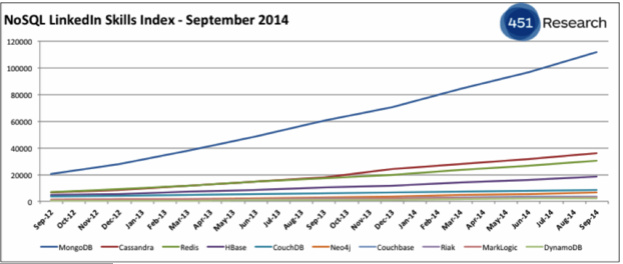 Hadoop获得了许多大数据应用的信誉,但事实是,NoSQL数据库是一直处于更加广泛部署与更广泛的发展中的技术。虽然选择Hadoop作为应用存储,相对来说更直接简单。但具体采用什么样的NoSQL数据库是个值得思考的问题,毕竟,还有超过100种的NoSQL数据库。 那么我们应该选择哪一种? 一、选择倾向 Martin Fowler认为,“任何像样规模的企业都会使用各种不同类型的数据存储技术,为应对各种不同类型的数据。”然而现实的情况是你没有足够的精力去学习更多的存储技术。 现在选择越来越容易,由于市场主要围绕在三个NoSQL数据库上:MongoDB,Cassandra(主要由DataStax开发的,诞生于Facebook)与HBase的(与Hadoop紧密关联在一起,也被相同社区开发出来)。 现在我们补充一点,我排除了Redis,mysql。相比于大数据存储,Redis主要用于高速内存缓存数据应用。 从LinkedIn的451研究数据显示,市场上最具引力的是MongoDB、Cassandra与HBase,如图1所示: 图1 图1是LinkedIn的个人资料数据。我们认为是数据存储引擎,它是通过收集工作、搜索等数据来了解数据库的热门程度。而Oracle,SQL Server与MySQL的占据了统治地位,MongoDB的(第5位),Cassandra(第9位),与HBase的(第15位)。 为了更好解释这三个数据库技术,我问的是每一个具有代表性的人,来确定它们成功关键因素: