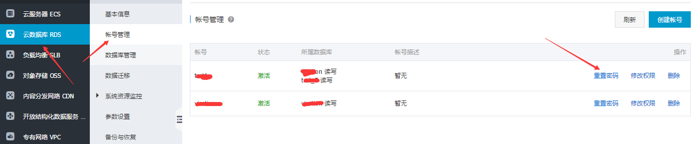 RDS DMS登陆的密码找回的方法 实际上,登录RDS DMS管理平台的用户密码,也就是RDS数据库本身创建的账号密码,所以在RDS控制台上重新修改数据库账号的密码,然后再进行登录DMS就可以了。主要有以下步奏: 1、在云数据库RDS控制台,【账号信息】中修改账号的密码。如下图所示: 2、修改账号密码后,用新密码登录DMS管理后台。如下图所示: 如问题还未解决,请联系售后技术支持 上一条: 关于DTS迁移后增加了表increment_trx 下一条: DTS数据迁移的使用须知