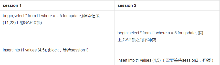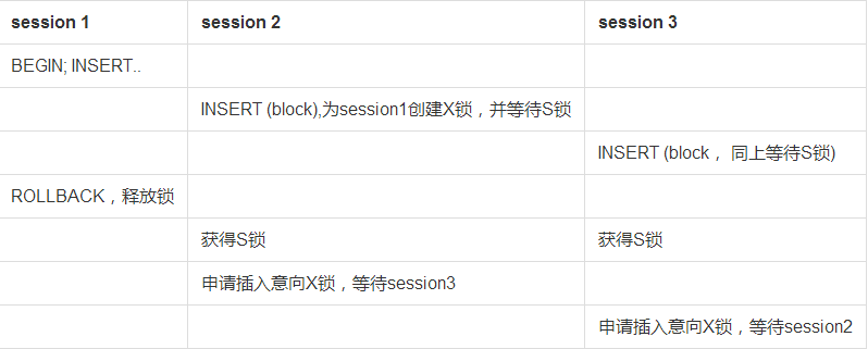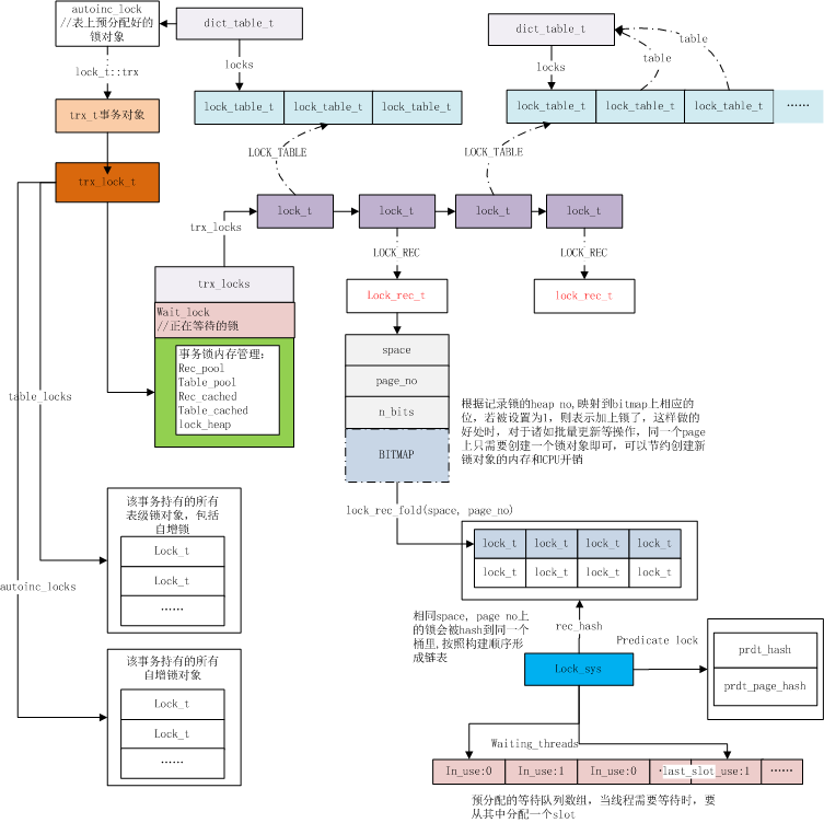 前言 本文的目的是对InnoDB的事务锁模块做个简单的介绍,使读者对这块有初步的认识。本文首先介绍表级锁与行级锁的相关概念,然后又介绍了其内部的一些实现,最后以两个有趣的案例结束本文。 本文所有的代码和示例都是基于MySQL5.7.10版本。 表级锁 InnoDB的表级别锁包含五种锁模式:LOCK_IS、LOCK_IX、LOCK_X、LOCK_S以及LOCK_AUTO_INC锁,锁之间的相容性遵循数组lock_compatibility_matrix中的定义。 InnoDB表级锁的目的是为了防止DDL和DML的并发问题。但从5.5版本开始引入MDL锁后,InnoDB层的表级锁的意义就没那么大了,MDL锁本身已经覆盖了其大部分功能。以下我们介绍下几种InnoDB表锁类型。 LOCK_IS/LOCK_IX 也就是所谓的意向锁,这实际上可以理解为一种“暗示”未来需要什么样行级锁,IS表示未来可能需要在这个表的某些记录上加共享锁,IX表示未来可能需要在这个表的某些记录上加排他锁。意向锁是表级别的,IS和IX锁之间相互并不冲突,但与表级S/X锁冲突。 在对记录加S锁或者X锁时,必须保证其在相同的表上有对应的意向锁或者锁强度更高的表级锁。 LOCK_S 在DDL的第一个阶段,如果当前DDL不能通过ONLINE的方式执行,则对表加LOCK_S锁(prepare_inplace_alter_table_dict) 设置会话的autocommit为OFF,执行LOCK TABLE tbname READ时,会加LOCK_S锁(ha_innobase::external_lock) LOCK_X 当加了LOCK_X表级锁时,所有其他的表级锁请求都需要等待。通常有这么几种情况需要加X锁: DDL操作的最后一个阶段(ha_innobase::commit_inlace_alter_table)对表上加LOCK_X锁,以确保没有别的事务持有表级锁。通常情况下Server层MDL锁已经能保证这一点了,在DDL的commit 阶段是加了排他的MDL锁的。但诸如外键检查或者刚从崩溃恢复的事务正在进行某些操作,这些操作都是直接InnoDB自治的,不走server层,也就无法通过MDL所保护。 当设置会话的autocommit变量为OFF时,执行LOCK TABLE tbname WRITE这样的操作会加表级的LOCK_X锁。(ha_innobase::external_lock) 对某个表空间执行discard或者Import操作时,需要加LOCK_X锁(ha_innobase::discard_or_import_tablespace) 从上面的描述我们可以看到LOCK_X及LOCK_S锁在实际的大部分负载中都很少会遇到。主要还是互相不冲突的LOCK_IS及LOCK_IX锁。一个有趣的问题是,每次加表锁时,却总是要扫描表上所有的表级锁对象,检查是否有冲突的锁。很显然,如果我们在同一张表上的更新并发度很高,这个链表就会非常长。 基于大多数表锁不冲突的事实,我们在RDS MYSQL中对各种表锁对象进行计数,在检查是否有冲突时,例如当前申请的是意向锁,如果此时LOCK_S和LOCK_X的锁计数都是0,就可以认为没有冲突,直接忽略检查。由于检查是在持有全局大锁lock_sys->mutex下进行的。在单表大并发下,这个优化的效果还是非常明显的,可以减少持有全局大锁的时间。 LOCK_AUTO_INC AUTO_INC锁加在表级别,和AUTO_INC、表级S锁以及X锁不相容。锁的范围为SQL级别,SQL结束后即释放。AUTO_INC的加锁逻辑和InnoDB的锁模式相关,这里在简单介绍一下。 通常对于自增列,我们既可以显式指定该值,也可以直接用NULL,系统将自动递增并填充该列。我们还可以在批量插入时混合使用者两种方式。不同的分配方式,其具体行为受到参数innodb_autoinc_lock_mode的影响。但在基于STATEMENT模式复制时,可能会影响到复制的数据一致性,官方文档 有详细描述,不再赘述,只说明下锁的影响。 自增锁模式通过参数innodb_autoinc_lock_mode来控制,加锁选择参阅函数ha_innobase::innobase_lock_autoinc 具体的,有以下几个值: AUTOINC_OLD_STYLE_LOCKING(0) 也就是所谓的传统加锁模式(在5.1版本引入这个参数之前的策略),在该策略下,会在分配前加上AUTO_INC锁,并在SQL结束时释放掉。该模式保证了在STATEMENT复制模式下,备库执行类似INSERT..SELECT这样的语句时的一致性,因为这样的语句在执行时无法确定到底有多少条记录,只有在执行过程中不允许别的会话分配自增值,才能确保主备一致。 很显然这种锁模式非常影响并发插入的性能,但却保证了一条SQL内自增值分配的连续性。 AUTOINC_NEW_STYLE_LOCKING(1) 这是InnoDB的默认值。在该锁模式下 普通的INSERT或REPLACE操作会先加一个dict_table_t::autoinc_mutex,然后去判断表上是否有别的线程加了LOCK_AUTO_INC锁,如果有的话,释放autoinc_mutex,并使用OLD STYLE的锁模式。 否则,在预留本次插入需要的自增值之后,就快速的将autoinc_mutex释放掉。很显然,对于普通的并发INSERT操作,都是无需加LOCK_AUTO_INC锁的。因此大大提升了吞吐量。 但是对于一些批量插入操作,例如LOAD DATA, INSERT...SELECT等还是使用OLD STYLE的锁模式,SQL执行期间加LOCK_AUTO_INC锁。 和传统模式相比,这种锁模式也能保证STATEMENT模式下的复制安全性,但却无法保证一条插入语句内的自增值的连续性,并且在执行一条混合了显式指定自增值和使用系统分配两种方式的插入语句时,可能存在一定的自增值浪费. 例如执行SQL: INSERT INTO t1 (c1,c2) VALUES (1,'a'), (NULL,'b'), (5,'c'), (NULL,’d’) 假设当前AUTO_INCREMENT值为101,在传统模式下执行完后,下一个自增值为103,而在新模式下,下一个可用的自增值为105,因为在开始执行SQL时,会先预取了[101, 104] 4个自增值,这和插入行的个数相匹配,然后将AUTO_INCREMENT设为105,导致自增值103和104被浪费掉。 AUTOINC_NO_LOCKING(2) 这种模式下只在分配时加个mutex即可,很快就释放,不会像NEW STYLE那样在某些场景下会退化到传统模式。因此设为2不能保证批量插入的复制安全性。 关于自增
