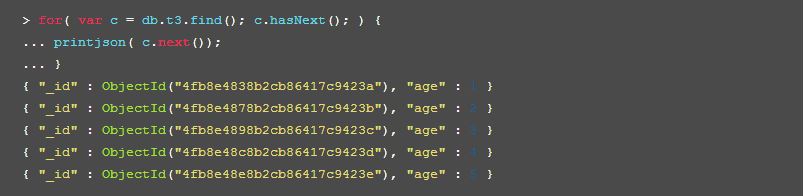 比起mysql,MongoDB最大的特点是他支持的查询语言非常强大,它的语法有点类似于面向对象的查询语言,几乎可以实现类似关系数据库单表查询的绝大部分功能,还支持对数据建立索引。 最后因为 MongoDB 可以支持复杂的数据结构,且带有强大的数据查询功能,所以因此非常受 到欢迎,很多项目都考虑用 MongoDB 来替代 MySQL 等传统数据库来实现不是特别复杂的 Web 应用。因为数据量实在太大,因此迁移到了 MongoDB 上面,数据查询的速度得到了非 常显著的提升。 下面将介绍一些查询语法 1、 条件操作符 <, <=, >, >= 这个操作符就不用多解释了 ,最常用也是最简单的,如以下代码所示: db.collection.find({ "field" : { $gt: value } } ); // 大于: field > value db.collection.find({ "field" : { $lt: value } } ); // 小于: field < value db.collection.find({ "field" : { $gte: value } } ); // 大于等于: field >= value db.collection.find({ "field" : { $lte: value } } ); // 小于等于: field <= value 若要同时满足多个条件,可以用下面这种方式: db.collection.find({ "field" : { $gt: value1, $lt: value2 } } ); // value1 < field < value 2、$all 匹配所有 这个操作符与 SQL 语法的 in 类似,不同的是, in 只需满足( )内的某一个值即可, 而$all 必须满足[ ]内的所有值,比如以下代码: db.users.find({age : {$all : [6, 8]}}); 可以查询出 {name: ‘David’, age: 26, age: [ 6, 8, 9 ] } 但查询不出 {name: ‘David’, age: 26, age: [ 6, 7, 9 ] } 3、$exists 判断字段是否存在 查询所有存在 age 字段的记录,如以下代码: db.users.find({age: {$exists: true}}); 查询所有不存在 name 字段的记录,如以下代码: db.users.find({name: {$exists: false}}); 示例: C1 表的数据如下所示: >db.c1.find(); { "_id" : ObjectId("4fb4a773afa87dc1bed9432d"), "age" : 20, "length" : 30 } { "_id" : ObjectId("4fb4a7e1afa87dc1bed9432e"), "age_1" : 20, "length_1" : 30 } 查询存在字段 age 的数据,如以下代码: > db.c1.find({age:{$exists:true}}); { "_id" : ObjectId("4fb4a773afa87dc1bed9432d"), "age" : 20, "length" : 30 } 可看出只显示出了有 age 字段的数据, age_1 的数据并没有显示出来 4、Null 值处理 Null 值的处理稍微有一点奇怪,具体看下面所示的样例数据: > db.c2.find() { "_id" : ObjectId("4fc34bb81d8a39f01cc17ef4"), "name" : "Lily", "age" : null } { "_id" : ObjectId("4fc34be01d8a39f01cc17ef5"), "name" : "Jacky", "age" : 23 } { "_id" : ObjectId("4fc34c1e1d8a39f01cc17ef6"), "name" : "Tom", "addr" : 23 } 其中 :”Lily”的 age 字段为空, Tom 没有 age 字段,我们想找到 age 为空的行,具体如下所示: > db.c2.find({age:null}) { "_id" : ObjectId("4fc34bb81d8a39f01cc17ef4"), "name" : "Lily", "age" : null } { "_id" : ObjectId("4fc34c1e1d8a39f01cc17ef6"), "name" : "Tom", "addr" : 23 } 令人奇怪的是我们以为只能找到”Lily”,但”Tom”也被找出来了 ,所以”null”不仅能找到它自身 ,连不存在 age 字段的记录也找出来了。那么怎么样才能只找到”Lily”呢?我们用 exists 来限制一下即可,如以下代码: > db.c2.find({age:{"$in":[null], "$exists":true}}) { "_id" : ObjectId("4fc34bb81d8a39f01cc17ef4"), "name" : "Lily", "age" : null } 这样如我们期望一样,只有”Lily”被找出来了。 5、$mod 取模运算 查询 age 取模 10 等于 0 的数据 db.student.find( { age: { $mod : [ 10 , 1 ] } } ) 示例: C1 表的数据如下,如以下代码: > db.c1.find() { "_id" : ObjectId("4fb4af85afa87dc1bed94330"), "age" : 7, "length_1" : 30 } { "_id" : ObjectId("4fb4af89afa87dc1bed94331"), "age" : 8, "length_1" : 30 } { "_id" : ObjectId("4fb4af8cafa87dc1bed94332"), "age" : 6, "length_1" : 30 } 查询 age 取模 6 等于 1 的数据,如以下代码: > db.c1.find({age: {$mod : [ 6 , 1 ] } }) { "_id" : ObjectId("4fb4af85afa87dc1bed94330"), "age" : 7, "length_1" : 30 } 我们可以看出只显示出了 age 取模 6 等于 1 的数据,其它不符合规则的数据并没有显示出来 6、$ne 不等于 查询 x 的值不等于 3 的数据,如以下代码: db.things.find( { x : { $ne : 3 } } ); 示例: C1 表的数据如下: > db.c1.find() { "_id" : ObjectId("4fb4af85afa87dc1bed94330"), "age" : 7, "length_1" : 30 } { "_id" : ObjectId("4fb4af89afa87dc1bed94331"), "age" : 8, "length_1" : 30 } { "_id" : ObjectId("4fb4af8cafa87dc1bed94332"), "age" : 6, "length_1" : 30 } 查询 age 的值不等于 7 的数据,如以下代码: > db.c1.find( { age : { $ne : 7 } } ); { "_id" : ObjectId("4fb4af89afa87dc1bed94331"), "age" : 8, "length_1" : 30 } { "_id" : ObjectId("4fb4af8cafa87dc1bed94332"), "age" : 6, "length_1" : 30 } 可以看出只显示出了 age 等于 7 的数据,其它不符合规则的数据并没有显示出来 7、$in 包含 与 sql 标准语法的用途是一样的,即要查询的是一系列枚举值的范围内查询 x 的值在 2,4,6 范围内的数据,如以下代码: db.things.find({x:{$in: [2,4,6]}}); 示例: C1 表的数据如下所示: > db.c1.find() { "_id" : ObjectId("4fb4af85afa87dc1bed94330"), "age" : 7, "length_1" : 30 } { "_id" : ObjectId("4fb4af89afa87dc1bed94331"), "age" : 8, "length_1" : 30 } { "_id" : ObjectId("4fb4af8cafa87dc1bed94332"), "age" : 6, "length_1" : 30 } 查询 age 的值在 7,8 范围内的数据,如以下代码: > db.c1.find({age:{$in: [7,8]}}); { "_id" : ObjectId("4fb4af85afa87dc1bed94330"), "age" : 7, "length_1" : 30 } { "_id" : ObjectId("4fb4af89afa87dc1bed94331"), "age" : 8, "length_1" : 30 } 我们可以看出只显示出了 age 等于 7 或 8 的数据,其它不符合规则的数据并没有显示出来 8、$nin 不包含 与 sql 标准语法的用途是一样的,即要查询的数据在一系列枚举值的范围外查询 x 的值在 2,4,6 范围外的数据 db.things.find({x:{$nin: [2,4,6]}}); 示例: C1 表的数据如下所示: > db.c1.find() { "_id" : ObjectId("4fb4af85afa87dc1bed94330"), "age" : 7, "length_1" : 30 } { "_id" : Objec