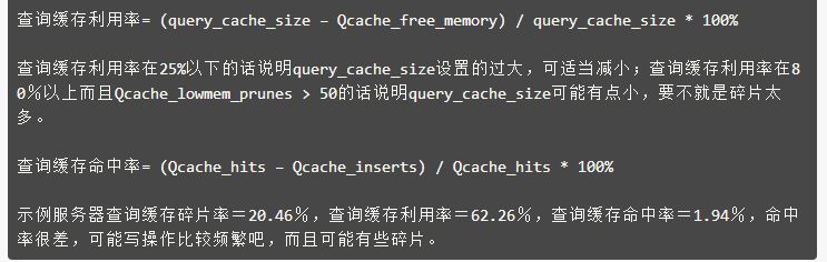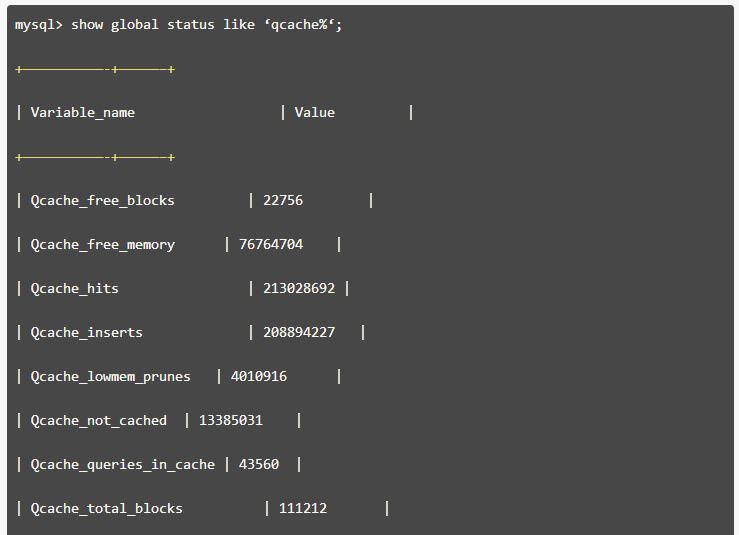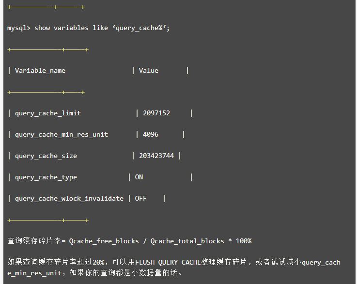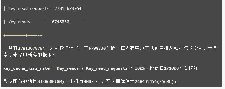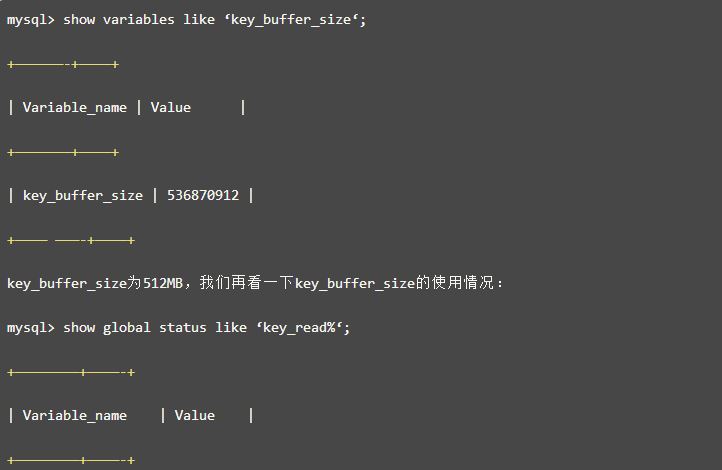 代码如下所示: 图1 max_used_connections / max_connections * 100% (理想值≈ 85%) 若max_used_connections与max_connections相同 那么就是max_connections设置过低或者超过服务器负载上限了,低于10%则设置过大。 2.back_log MySQL能暂存的连接数量。当主要MySQL线程在一个很短时间内得到非常多的连接请求,这就起作用。若MySQL的连接数据达到max_connections时,新来的请求将会被存在堆栈中,以等待某一连接释放资源,该堆栈的数量即back_log,如果等待连接的数量超过back_log,将不被授予连接资源。 back_log值指出在MySQL暂时停止回答新请求之前的短时间内有多少个请求可以被存在堆栈中。只有如果期望在一个短时间内有很多连接,你需要增加它,换句话说,这值对到来的TCP/IP连接的侦听队列的大小。 当观察你主机进程列表(mysql> show full processlist),发现大量264084 | unauthenticated user | xxx.xxx.xxx.xxx | NULL | Connect | NULL | login | NULL 的待连接进程时,就要加大back_log 的值了。 默认数值是50,可调优为128,对于Linux系统设置范围为小于512的整数。 3. interactive_timeout 一个交互连接在被服务器在关闭前等待行动的秒数。一个交互的客户被定义为对mysql_real_connect()使用CLIENT_INTERACTIVE 选项的客户。 默认数值为28800,可调优为7200。 二、缓冲区变量 1.全局缓冲: 1.1key_buffer_size key_buffer_size指定索引缓冲区的大小,它决定索引处理的速度,特别是索引读的速度。通过检查状态值Key_read_requests和Key_reads,可以知道key_buffer_size设置是否合理。比例key_reads / key_read_requests应该尽可能的低,至少是1:100,1:1000更好(上述状态值可以使用SHOW STATUS LIKE ‘key_read%’获得)。 key_buffer_size只对MyISAM表起作用。即使你不使用MyISAM表,但是内部的临时磁盘表是MyISAM表,也要使用该值。可以使用检查状态值created_tmp_disk_tables得知详情。 示例代码如下: 图2 1.2 query_cache_size 使用查询缓冲,MySQL将查询结果存放在缓冲区中,今后对于同样的SELECT语句(区分大小写),将直接从缓冲区中读取结果。 通过检查状态值Qcache_*,可以知道query_cache_size设置是否合理(上述状态值可以使用SHOW STATUS LIKE ‘Qcache%’获得)。如果Qcache_lowmem_prunes的值非常大,则表明经常出现缓冲不够的情况,如果Qcache_hits的值也非常大,则表明查询缓冲使用非常频繁,此时需要增加缓冲大小;如果Qcache_hits的值不大,则表明你的查询重复率很低,这种情况下使用查询缓冲反而会影响效率,那么可以考虑不用查询缓冲。此外,在SELECT语句中加入SQL_NO_CACHE可以明确表示不使用查询缓冲。 与查询缓冲有关的参数还有query_cache_type、query_cache_limit、query_cache_min_res_unit。