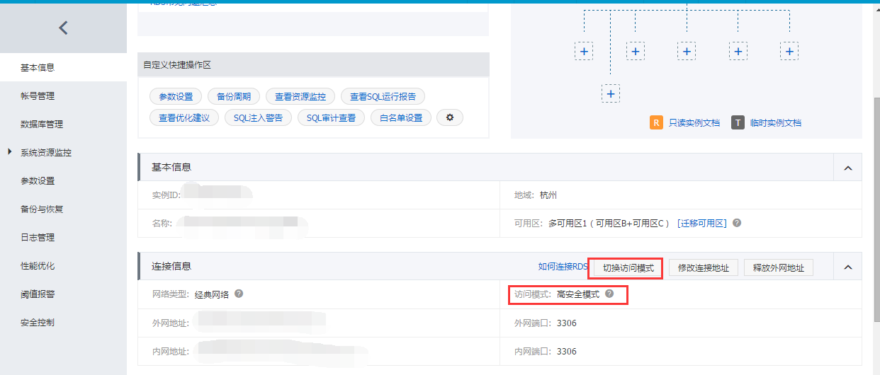RDS的SQL注入拦截功能介绍 云数据库RDS中: 高安全模式支持SQL注入防护功能, 标准模式不支持sql注入防护功能, 如果需要SQL注入防护功能请先切换到高安全模式,切换前一定要了解切换会带来的影响,切换时会有闪断,建议在业务允许的情况下进行。 关于2种模式的介绍请点这里查阅。 切换的方法是在RDS控制台【连接信息】,如下图所示: 如问题还未解决,请联系售后技术支持。 上一条: DTS数据迁移的使用须知
