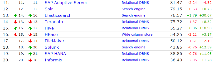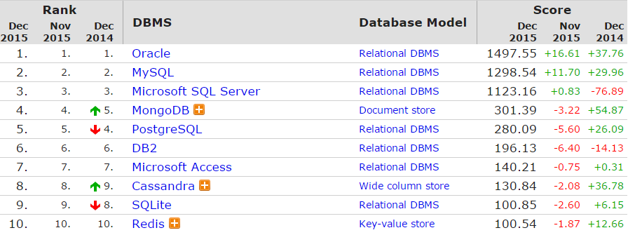 在2015年的最后一个月,我们来继续揭晓数据库流行榜单,与11月的相比,前20名的各自稳守阵地,岿然不动。 Oracle排在第一名,此次得分1497.55,比11月份增加16分,比去年同期增加37分,值得庆祝。新近举行的Oracle OpenWorld 2015不仅展示了完整物联网解决方案,而且还推出了Oracle商务智能12c与Oracle Exadata数据库云服务器X5-8,可谓是锦上添花。 第二名是MySQL,MySQL朝着1300分迈进,排在第三的Microsoft SQL Server比去年同期分数下降了76,还需努力。排第四的MongoDB,它的分数勉强维持在300,但是与去年同期相比,分数增加54,也是前20名数据库中增加最多的。 下图是为数据库知识网站DB-engines.com更新的2015年12月份前20名榜单,如图1所示: 附:DB-Engines的排名主要根据以下5个因素来进行: