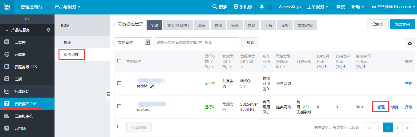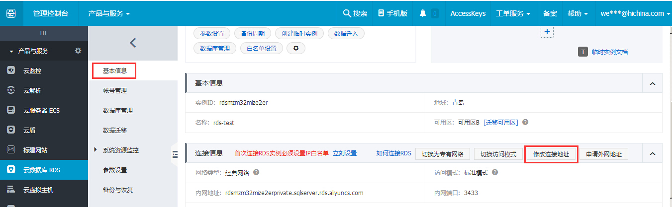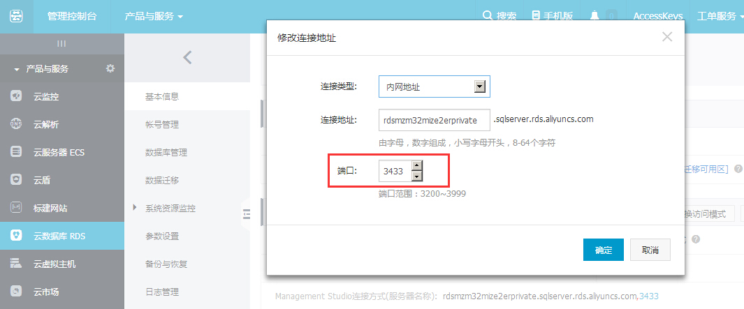 如何在云数据库RDS中修改连接地址和端口 操作方法: 1. 访问https://rdsnew.console.aliyun.com/登录RDS管理控制台--【云数据库RDS】--【实例列表】--【管理】,如下图所示: 2. 点击【基本信息】--【修改连接地址】,如下图所示: 3. 选择连接类型,修改对应的地址和端口,如下图所示: 如果问题还未能解决,请联系售后技术支持。 上一条: RDS查看库和表的大小的方法