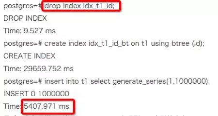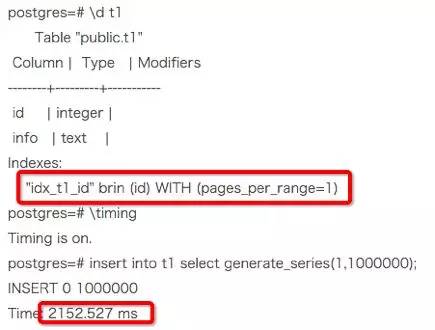 但是此时你会发现,系统 SELECT 性能相比 B-Tree 要低不少。 那 BRIN 有什么用处呢?请见以下另一个 DEMO 测试 Insert 性能,如下所示: 图10