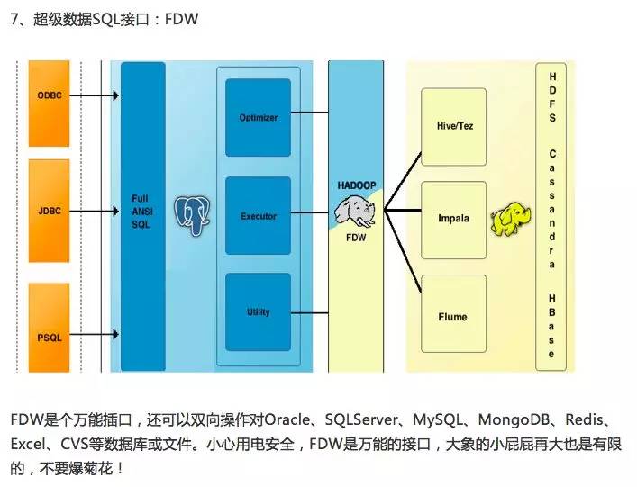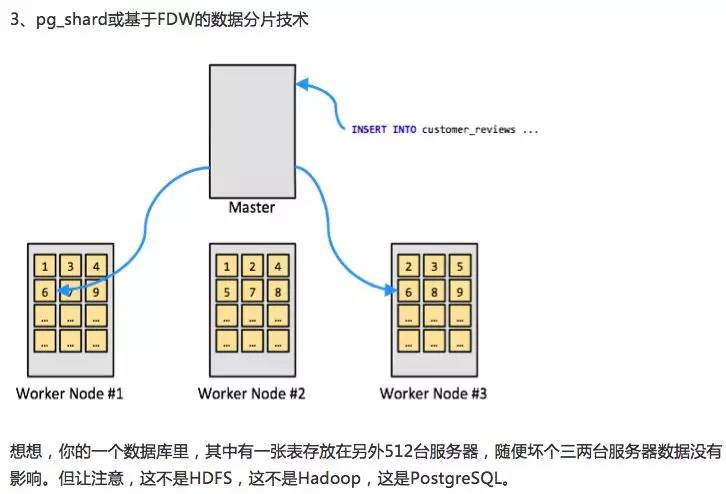我们可以明确看到,B-Tree 下 Insert 性能比 BRIN 慢了 1 倍,因此对于只要进行少量“等于”或“范围查询”操作,但要求高速数据写入的场景这是十分适用的。如:按日期存放的日志表。 另外方面如同 Oracle Exadata 的 Storage Index,在一个类索引结构中存储一定范围的数据块中某个列的最小和最大值。 当查询语句中包含该列的过滤条件时,就会自动忽略那些肯定不包含符合条件的列值的数据块,从而减少 IO 读取量,提升查询速度,当然是会比 btree 慢一些。 3.P 数据分析操作支持 array_agg, GROUPING SETS, CUBE, and ROLLUP(略过,有用到这些功能的都懂) 这是 9.5版本 的新功能 4.w-Level Security (RLS) 若你是 Oracle 的粉丝,VPD 是不会陌生的。这一功能在“ PCI DSS – 支付卡行业(PCI)数据安全标准”是十分重要的一个实现手段,可以确保任何用户都不会读取到其它用户的信息,所有用户实现最核心的隔离。 在 PostgreSQL 9.5 中我们叫它做 RLS,通过以下操作我们就可以启动 RLS,如下所示: 图11 接下来我们可以进行一些测试操作,如下所示: 图12 建立了两个用户,通过“SET SESSION AUTHORIZATION”操作,相当于是用不同的用户进行登陆后再执行 INSERT 操作。如下所示: 图13 转换为 postgres 超级用户身份后,我们可以看到所有数据,但当前我使用 emp1 和 emp2 用户身份操作时,我们将只能得到当前用户写入的数据。如下所示: 图14 5.L 日志压缩 PostgreSQL 以 16MB 为单位保存 WAL 日志文件,因为日志文件会保存数据写入前及写入后的信息,因此在大量 UPDATE 及 DELETE 操作后 WAL 会持续增大。 这将大量占用用户的归档空间,如果用户需要通过网络将WAL存放到远端网络存储或磁带机中,就会导致网络带宽大量备占用。 PostgreSQL 9.5 提供了 WAL 日志压缩功能解决此问题,写日志时候对数据块进行压缩。 往磁盘写更少的数据,复制的传输的量也会少,可以更新的性能提高,但 CPU的消耗量会上升。如下所示: 图15 图16 6._rewind功能 自 9.0 开始 PostgreSQL 提供流式数据复制功能 Streaming Replication,以实现两个数据库商的数据同步。如下所示 图17 但是在 9.5 版本以前,一旦数据库的 Master 节点出现硬件故障导致系统宕机,在主节点维修完毕想要重新加入到数据库集群时,我们往往需要对此数据库进行重新的全量数据初始化。 如果数据量在 100GB 以下恢复时间还是可以接受的,然而一旦数据少为大一点,到达几百 GB 甚至 TB 级别,全量数据初始化将是一个灾难!如下所示 图18 因为PostgreSQL 基于文件系统进行数据存储,因此我们也可以借助 rsync,但由于 rsync 无法做到 Block 块级别的数据差异复制,时间依然很难达到用户要求。 所以 PostgreSQL 9.5 提供了 pg_rewind,这是一个同步 PostgreSQL 数据目录的工具,其结果等同于用 rsync 同步 data 数据目录。 pg_rewind 的优点是,它用 WAL 来确定更改的数据块,不需要在集群里读取所有文件,当数据库很大时,这样的特性会让它运行起来更快。 7.ONB 数据操作增强 PostgreSQL 自从 9.2 开始提供 JSON 的支持,对于哪些只通过 node.js 开发应用系统的同学来说,JSON 数据最佳的数据库当然是 MongoDB。 但对于传统就使用关系型数据库的企业用户及应用软件开发商而言,SQL 是根本,系统要求严谨的 ACID 关联,开发人员也不习惯使用 SQL 以外语法。 特别是很多系统已经持续开发集成 3 年甚至 5 年,但由于当前需要对接互联网,而再构建一个新的 MongoDB 进行 JSON 数据存储,开发端就显得特别麻烦。如下所示 图19 而在 PostgreSQL 中,你可以: 图20 我们可以看到,通过 json_data 表中 data 字段的 name 属性,我们混合 SQL及 JSON 实现了一次数据库内部的跨表 JOIN。 若你担心性能问题,你还可以在data->>’name’这个属性上建立GIN索引,操作如图13所示 图21 但是此处要注意,我们使用“?”问号作为数据比对的操作符而不是“=”等号。 在最新的 PostgreSQL 9.5 中增加的多个进行 JSON 数据内部操作的特性,如下所示: 图22 通过这些特性我们通过 SQL 函数对 JSON 对象内部的属性进行动态的添加及修改,整个操作就如同在 SQL 中操作 Redis 一样,十分方便。 在 PostgreSQL 中使用 JSON 除了可以更好地处理移动互联网数据外,对于传统业务的由于业务形态可能随时变化,而导致数据库中“宽表”设计也有很大的帮助。 在 PostgreSQL 中可以将所有“宽表”的列定义成一个 JSONB 字段即可,未来因应数据操作需求,可以再进行不同属性的索引处理。对于以下多种业务都十分实用: (1)务系统中资产管理的“卡片”数据 (2)疗行业用户病历管理 (3)育行业中学生考卷管理 (4)售行业中产品资料及标识的管理 四、PostgresSQL 还可以做什么 图23 图24 图25 图26 图27 图28 图29 五、问答环节 1、布道者为什么要用 pg?对比 db2 oracle mysql 有什么优势? 布道者为什么用 PG: (1)功能要求(如:JSON、GIS、分析函数、窗口函数)。 (2)性能要求(多表 JOIN、复杂事务并发)。 (3)基于线程体系稳定性。 (4)于 BSD 协议开放,没有 GPL 的开源限制。 (5)经在此行业看到大量机会。 (6)果以上你就同意,那就是癖好、情结。 MySQL:PG 除地市场差点,PG 会给你更多的功能体验,在复杂系统中大大节省开发人员时间; Oracle:成本优势,不要告诉我你公司都是正版,在功能不差的前提下 PG 绝对与 Oracle 谐美(除了一点 RAC 在最佳环境下数据库故障 0 中断,PG 用 HA 所以最少要 20 秒); DB2:只要你给我一小机,PG 也可以 2、PG 可以把堆表按照一个索引来组织行?把 Prox