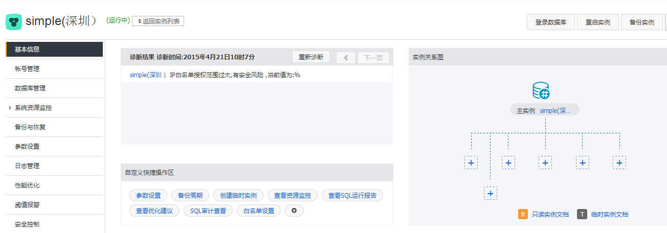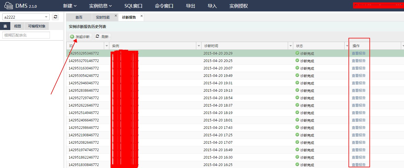 查看RDS的实例诊断报告的方法 查看方法: RDS提供的实例诊断报告非常详细,是DBA分析数据库性能的最佳途径,这里介绍怎么打开与生成诊断报告。客户登陆RDS控制台https://rds.console.aliyun.com/console/index,进入实例列表--管理,如下图所示: 在RDS控制台点击“登陆数据库”后,进入DMS系统;点击DMS系统的“实例信息”-“诊断报告”即可查看已有报告,也可以点击“发起诊断”查看最新的报告。如下图所示: 如问题还未解决,请联系售后技术支持。 上一条: 云数据库RDS自定义参数如何修改的操作 下一条: RDS价格总览及计费方式