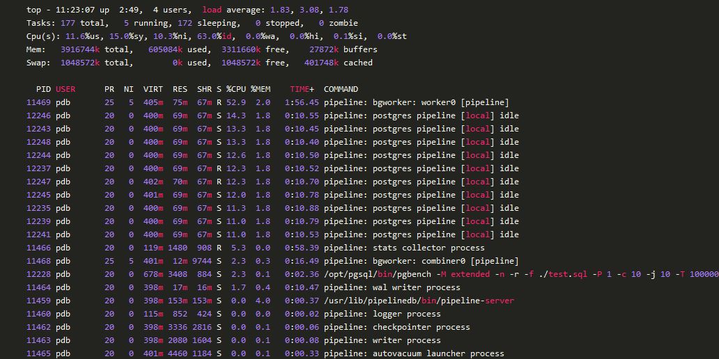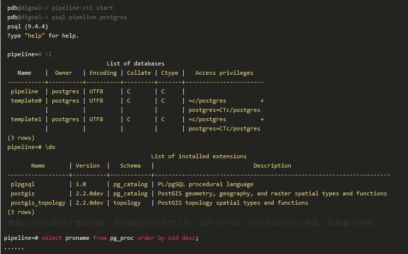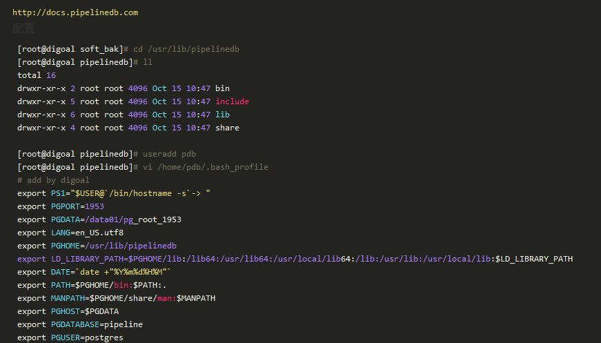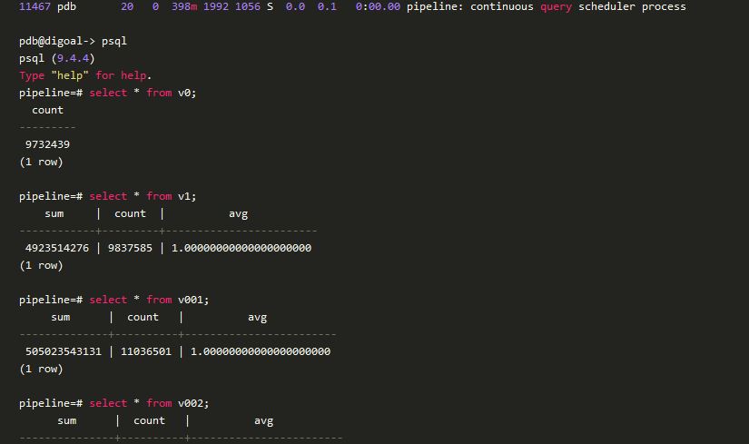 PipelineDB是基于PostgreSQL研发的一种流式关系数据库(0.8.1基于9.4.4),这种数据库的特点是自动处理流式数据,不存储原始数据,只存储处理后的数据,所以非常适合当下流行的实时流式数据处理,例如网站流量统计,IT服务的监控统计,APPStore的浏览统计等等。 http://... PipelineDB是基于PostgreSQL研发的一种流式关系数据库(0.8.1基于9.4.4),这种数据库的特点是自动处理流式数据,不存储原始数据,只存储处理后的数据,因此非常适合当下流行的实时流式数据处理,比如APPStore的浏览统计,网站流量统计,IT服务的监控统计等等。 http://www.postgresql.org/about/news/1596/ PipelineDB, an open-source relational streaming-SQL database, publicly released version (0.7.7) today and made the product available as open-source via their website and GitHub. PipelineDB is based on, and is wire compatible with, PostgreSQL 9.4 and has added functionality including continuous SQL queries, probabilistic data structures, sliding windowing, and stream-table joins. For a full description of PipelineDB and its capabilities see their technical documentation. PipelineDB’s fundamental abstraction is what is called a continuous view. These are much like regular SQL views, except that their defining SELECT queries can include streams as a source to read from. The most important property of continuous views is that they only store their output in the database. That output is then continuously updated incrementally as new data flows through streams, and raw stream data is discarded once all continuous views have read it. Let's look at a canonical example: CREATE CONTINUOUS VIEW v AS SELECT COUNT(*) FROM stream Only one row would ever physically exist in PipelineDB for this continuous view, and its value would simply be incremented for each new event ingested. For more information on PipelineDB as a company, product and for examples and benefits, please check out their first blog post on their new website. 举例: 创建动态流视图,不需要对表进行定义,这类似活生生的NoSQL。参考代码如下所示: pipeline=# CREATE CONTINUOUS VIEW v0 AS SELECT COUNT(*) FROM stream; CREATE CONTINUOUS VIEW pipeline=# CREATE CONTINUOUS VIEW v1 AS SELECT COUNT(*) FROM stream; CREATE CONTINUOUS VIEW 激活流视图 pipeline=# ACTIVATE; ACTIVATE 2 往流写入数据,参考代码如下所示: pipeline=# INSERT INTO stream (x) VALUES (1); INSERT 0 1 pipeline=# SET stream_targets TO v0; SET pipeline=# INSERT INTO stream (x) VALUES (1); INSERT 0 1 pipeline=# SET stream_targets TO DEFAULT; SET pipeline=# INSERT INTO stream (x) VALUES (1); INSERT 0 1 -- 如果不想接收流数据了,停止即可 pipeline=# DEACTIVATE; DEACTIVATE 2 查询流视图,餐阿卡欧代码如下所示: pipeline=# SELECT count FROM v0; count ------- 3 (1 row) pipeline=# SELECT count FROM v1; count ------- 2 (1 row) pipeline=# 在本地虚拟机进行试用 安装,参考代码如下所示: 初始化数据库,参考代码如下所示: pdb@digoal-> psql -V psql (PostgreSQL) 9.4.4 pdb@digoal-> cd /usr/lib/pipelinedb/bin/ pdb@digoal-> ll total 13M -rwxr-xr-x 1 root root 62K Sep 18 01:01 clusterdb -rwxr-xr-x 1 root root 62K Sep 18 01:01 createdb -rwxr-xr-x 1 root root 66K Sep 18 01:01 createlang -rwxr-xr-x 1 root root 63K Sep 18 01:01 createuser -rwxr-xr-x 1 root root 44K Sep 18 01:02 cs2cs -rwxr-xr-x 1 root root 58K Sep 18 01:01 dropdb -rwxr-xr-x 1 root root 66K Sep 18 01:01 droplang -rwxr-xr-x 1 root root 58K Sep 18 01:01 dropuser -rwxr-xr-x 1 root root 776K Sep 18 01:01 ecpg -rwxr-xr-x 1 root root 28K Sep 18 00:57 gdaladdo -rwxr-xr-x 1 root root 79K Sep 18 00:57 gdalbuildvrt -rwxr-xr-x 1 root root 1.3K Sep 18 00:57 gdal-config -rwxr-xr-x 1 root root 33K Sep 18 00:57 gdal_contour -rwxr-xr-x 1 root root 188K Sep 18 00:57 gdaldem -rwxr-xr-x 1 root root 74K Sep 18 00:57 gdalenhance -rwxr-xr-x 1 root root 131K Sep 18 00:57 gdal_grid -rwxr-xr-x 1 root root 83K Sep 18 00:57 gdalinfo -rwxr-xr-x 1 root root 90K Sep 18 00:57 gdallocationinfo -rwxr-xr-x 1 root root 42K Sep 18 00:57 gdalmanage -rwxr-xr-x 1 root root 236K Sep 18 00:57 gdal_rasterize -rwxr-xr-x 1 root root 25K Sep 18 00:57 gdalserver -rwxr-xr-x 1 root root 77K Sep 18 00:57 gdalsrsinfo -rwxr-xr-x 1 root root 49K Sep 18 00:57 gdaltindex -rwxr-xr-x 1 root root 33K Sep 18 00:57 gdaltransform -rwxr-xr-x 1 root root 158K Sep 18 00:57 gdal_translate -rwxr-xr-x 1 root root 168K Sep 18 00:57 gdalwarp -rwxr-xr-x 1 root root 41K Sep 18 01:02 geod -rwxr-xr-x 1 root root 1.3K Sep 18 00:51 geos-config lrwxrwxrwx 1 root root 4 Oct 15 10:47 invgeod -> geod lrwxrwxrwx 1 root root 4 Oct 15 10:47 invproj -> proj -rwxr-xr-x 1 root root 20K Sep 18 01:02 nad2bin -rwxr-xr-x 1 root root 186K Sep 18 00:57 nearblack -rwxr-xr-x 1 root root 374K Sep 18 00:57 ogr2ogr -rwxr-xr-x 1 root root 77K Sep 18 00:57 ogrinfo -rwxr-xr-x 1 root root 283K Sep 18 00:57 ogrlineref -rwxr-xr-x 1 root root 47K Sep 18 00:57 ogrtindex -rwxr-xr-x 1 root root 30K Sep 18 01:01 pg_config -rwxr-xr-x 1 root root 30K Sep 18 01:01 pg_controldata -rwxr-xr-x 1 root root 33K Sep 18 01:01 pg_isready -rwxr-xr-x 1 root root 39K Sep 18 01:01 pg_resetxlog -rwxr-xr-x 1 root root 183K Sep 18 01:02 pgsql2shp lrwxrwxrwx 1 root root 4 Oct 15 10:47 pipeline -> psql -rwxr-xr-x 1 root root 74K Sep 18 01:01 pipeline-basebackup lrwxrwxrwx 1 root root 9 Oct 15 10:47 pipeline-config -> pg_config -rwxr-xr-x 1 root root 44K Sep 18 01:01 pipeline-ctl -rwxr-xr-x 1 root root 355K Sep 18 01:01 pipeline-dump -rwxr-xr-x 1 root root 83K Sep 18 01:01 pipeline-dumpall -rwxr-xr-x 1 root root 105K Sep 18 01:01 pipeline-init -rwxr-xr-x 1 root root 50K Sep 18 01:01 pipeline-receivexlog -rwxr-xr-x 1 root root 56K Sep 18 01:01 pipeline-recvlogical -rwxr-xr-x 1 root root 153K Sep 18 01:01 pipeline-restore -rwxr-xr-x 1 root root 6.2M Sep 18 01:01 pipeline-server lrwxrwxrwx 1 root root 15 Oct 15 10:47 postmaster -> pipeline-server -rwxr-xr-x 1 root root 49K Sep 18 01: