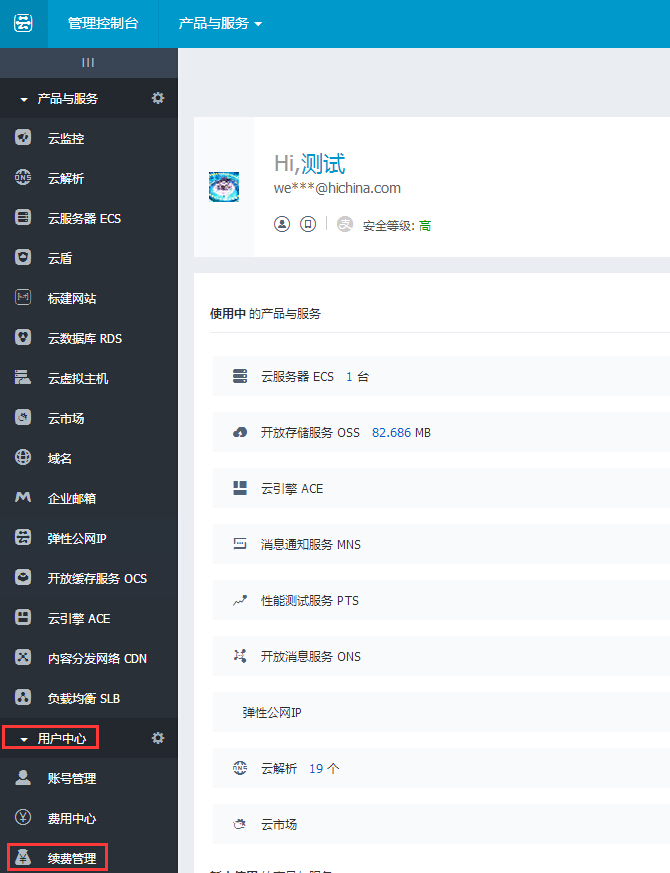 1. 登录管理控制台:https://home.console.aliyun.com/ ,下方【用户中心】--【续费管理】,如下图所示: