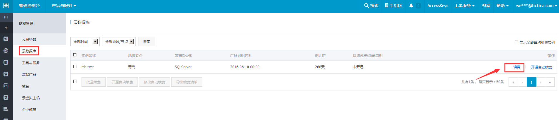 2. 点击【云数据库】--【续费】,如下图所示: