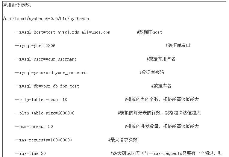 关于RDS for MySQL的各规格性能测试情况 注:该性能报告是参考的测试数据,不作为产品SLA的评判标准。 一. 简介 通过该性能测试报告,让用户了解到在sysbench标准测试模型下,每种规格的RDS的性能表现,供用户做容量选型参考。 二. 名词解释 1. QPS: 表示每秒执行的SQL语句的次数包括select,insert,delete等。 2. 规格:RDS为用户提供的不同性能的套餐,以内存大小为衡量标准,比如240M内存的RDS实例。 3. 行数:测试模型下,该实例所拥有的所有表格的总行数。 4. 工作集数据:测试的数据量大小,并且在测试中这些数据都会频繁被使用。 5. 并发数:测试线程的数量 6. 表数量:该测试模型下表的总数,每表行数=行数/表数 7. semi-sync(Semisynchronous Replication,半同步): 跟async一样,是MySQL复制中传输日志的另外一种模式,叫半同步复制,在RDS (MySQL5.5)中引入并支持。在这种模式下数据的安全性得到了最大保障,但会损失一定的写入性能。 8. async(Asynchronous Replication,异步):MySQL复制中传输日志的一种模式,MySQL默认支持的就是这种模式,最为通用,在不影响主库性能的前提下尽可能地保证数据的安全。 三. 测试模型 测试工具:sysbench 0.5 测试流程:通过对每种规格的实例进行压测,得出每种规格的RDS实例的性能表现 测试模型:采用OLTP模型(读写比例为7:3)和InnoDB引擎。大致命令如下: 常用命令参数如下: 四. 每种RDS for MySQL规格的资源配额,如下图所示: 五. 每种规格的测试数据,如下图所示: 注: 24000M规格由于数据库性能容量非常高,一个sysbench客户无法压满RDS实例,因此我们采用了两个sysbench客户端来同时进行压测,并且两个sysbench对不同的数据库和表格进行压测。 六. QPS测试结果,如下图所示: 具体每种规格的RDS for MySQL的QPS性能曲线如下图: 七. MySQL 5.5半同步与异步性能对比 从理论上分析MySQL 5.5的半同步的写性能会比异步的写性能差不少。但是从上面的测试结果来看相差并不大.原因是上面的测试模型是读写比例为7:3,写入不大的情况下,半同步的影响较小。 为此我们将进行纯insert压测来比较半同步和异步的性能。 测试模型与上面7:3的读写测试模型类似,只是把oltp.lua脚本换成insert.lua脚本。也就是把“--test=/tmp/sysbench-0.5/sysbench/tests/db/oltp.lua“参数换成“—test=/tmp/sysbench-0.5/sysbench/tests/db/insert.lua”。 下面这张图是纯insert压测,半同步和异步的性能曲线,从中可以看出: 1) 使用异步模式,随着规格的增加,性能越来越好,每秒插入的记录数跟实例的IOPS密切相关。 2) 使用半同步模式,每秒插入的记录数变化不大,稳定在5300条左右。主要是因为半同步的数据同步出现瓶颈。