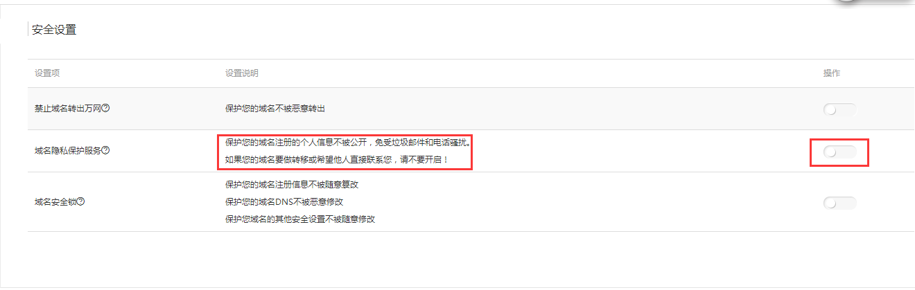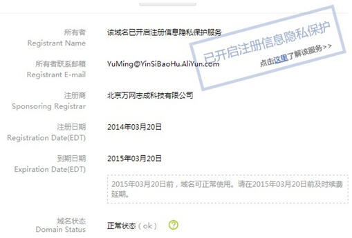 1、为什么我的有, 显示不是我注册的? 答:由于万网对中英文.com/.net等域名提供了免费的域名注册信息隐私保护服务,隐私保护服务开启的域名,在查询whois时,真实的注册人联系方式、注册者信息等都不会对外公示。如下图。 2、如何才能显示自己的真实信息? 登录万网/阿里云——【管理控制台】——【产品与服务】——【域名】,进入“管理”页面,点击上方【安全】,关闭域名隐私保护服务即可。 上一条: 关于国际中文域名注册相关问题 下一条: 关于.co域名注册规则 |