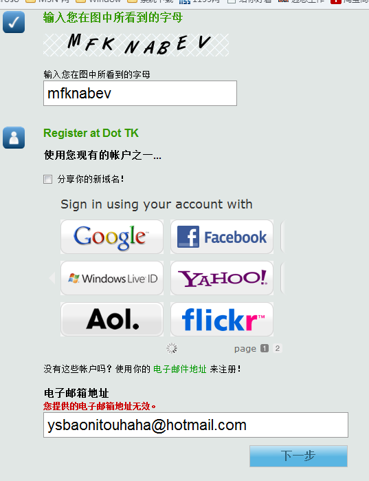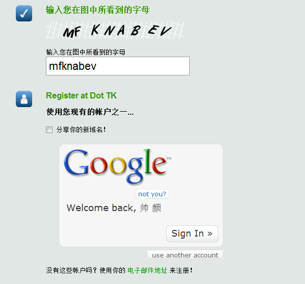 用那谷歌账户登也不行 用谷歌账户登录之后就是这样,不知道点哪 网友采纳直接点击那个谷歌邮箱的标志 不要注册用户了直接使用你自己的谷歌邮箱登陆即可登录以后选择自己喜欢的域名就是了,另外,你若只是玩玩,选择这个域名无所谓若你是要开正规一点点的网站还是自己买一个域名好一点COM域名一年也就是60元左右若你还要便宜的,就买info这个后缀的域名,价格一年也就是20元左右 上一条: 域名不通过第三方注册,那该在哪注册第一手 下一条: 在哪里能够申请到免费域名 |