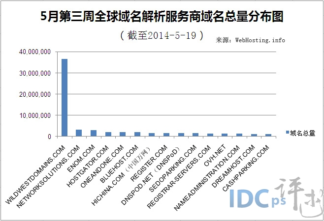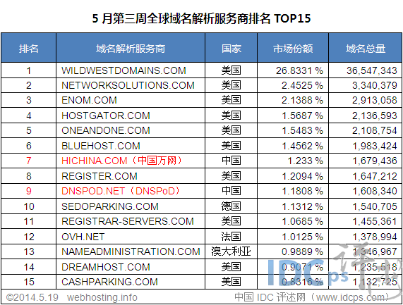 万网、DNSPod份额上5月第三周全球域名解析商Top15榜单