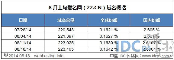 爱名网域名8月上旬净增2862个,总量升至22.3万