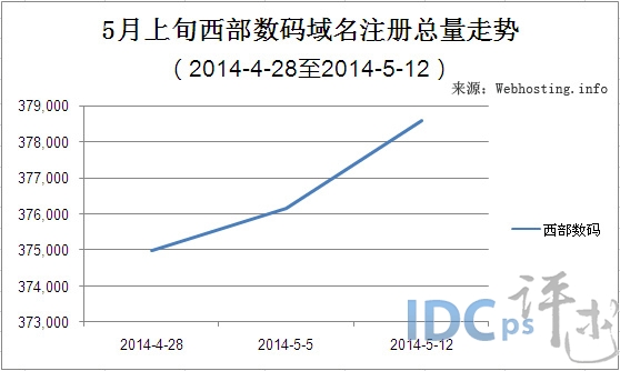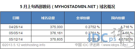 5月上旬,西部数码域名净增3,605个,国内市场份额小降至4.6788%