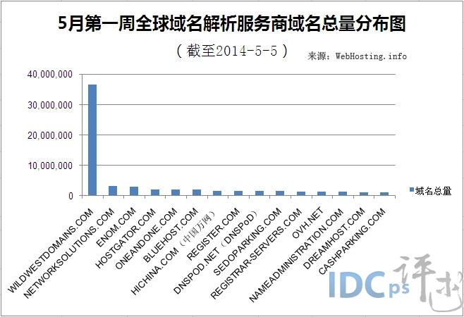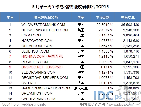 5月第一周全球域名解析商Top15:WILDWESTDOMAINS.COM称霸全球,万网升至第7名