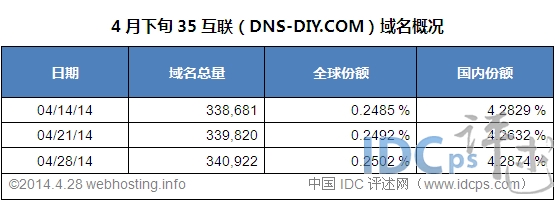 4月下旬,35互联域名净增2,241个,国内市场份额小升至4.2874%