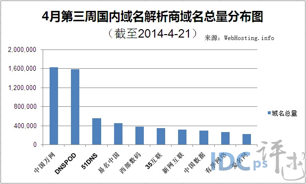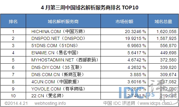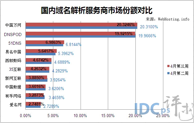 国内域名解析商4月第三周Top10:万网升至20.32%,DNSPOD份额下滑