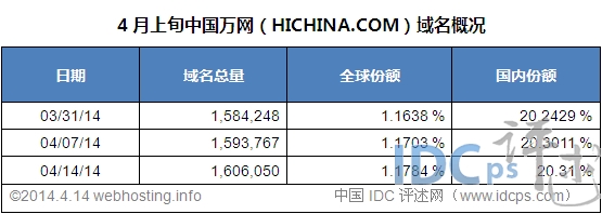 中国万网4月上旬域名净增21,802个,国内市场份额上升至20.31%