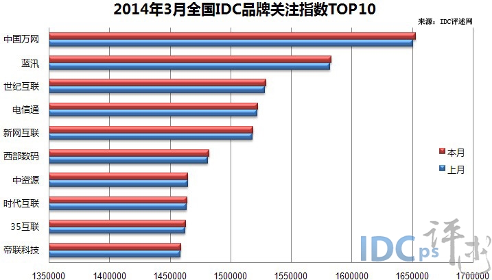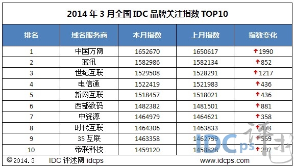 IDC品牌3月关注指数前十 中国万网涨幅逼近两千,蓝汛紧随其后