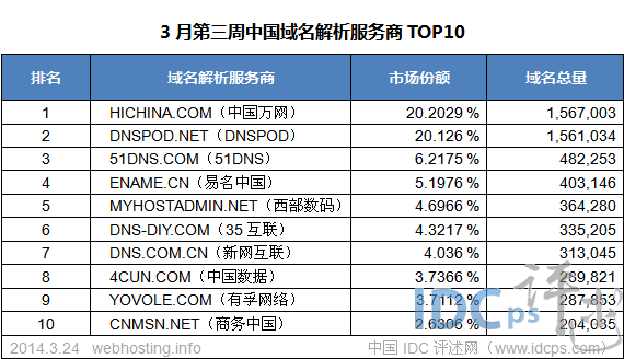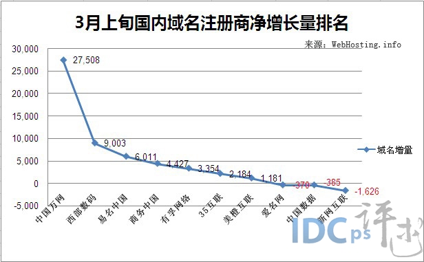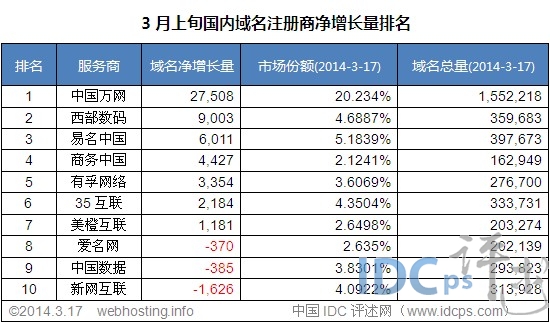 国内域名商3月上旬净增量Top10:万网夺冠,西部数码居亚军