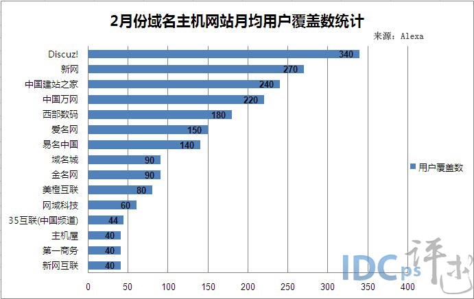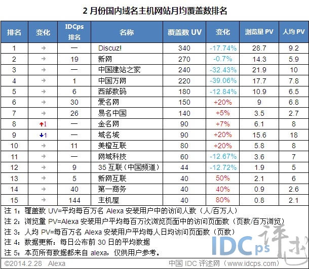国内域名主机网站2月周Top15: 新网第二,Discuz!居首
