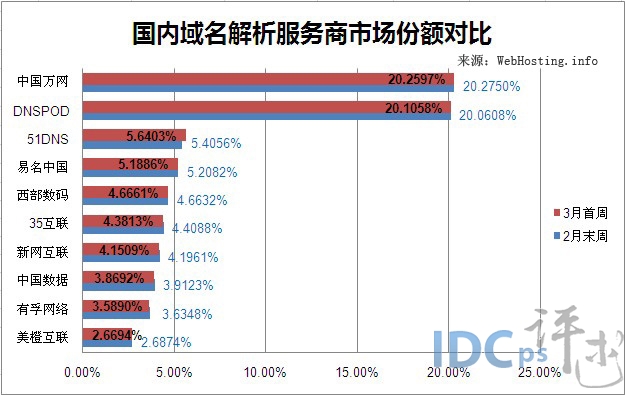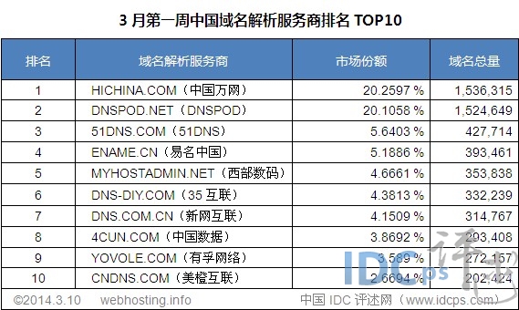 国内域名解析商3月第一周Top10榜单:美橙互联上位前10,爱名网跌出10